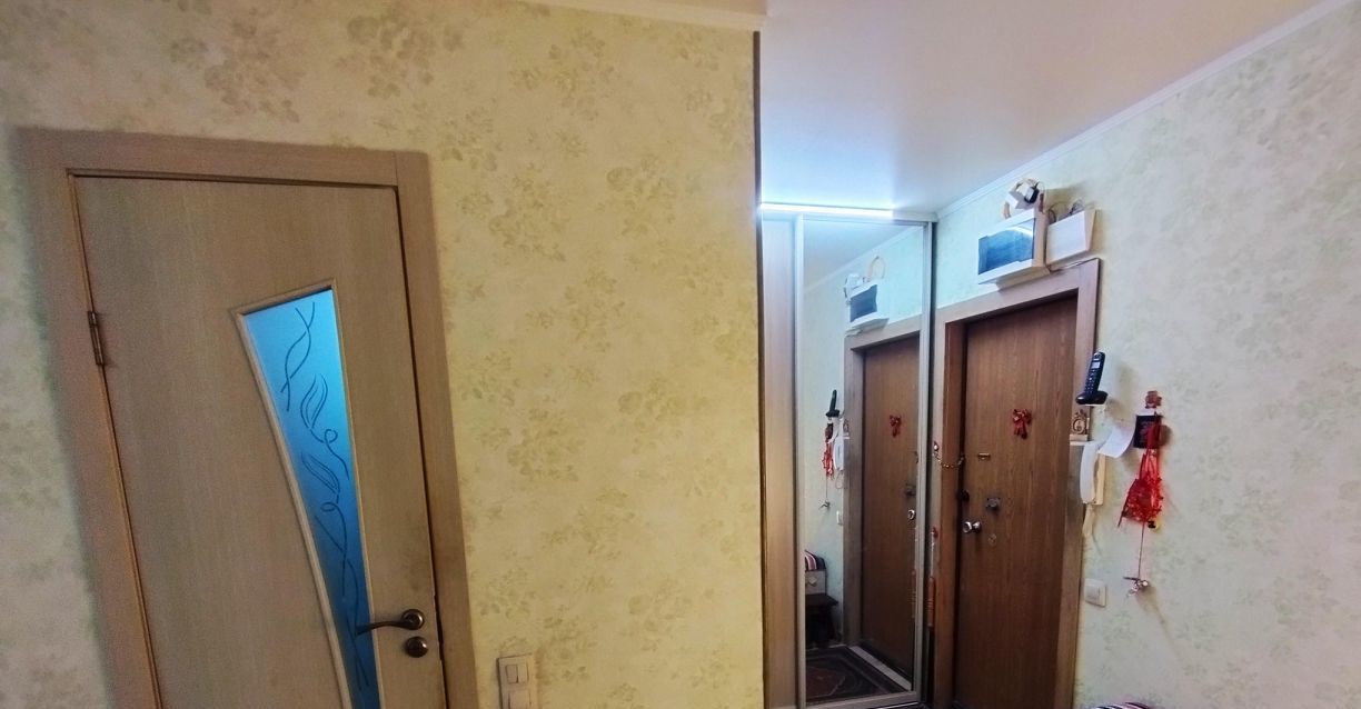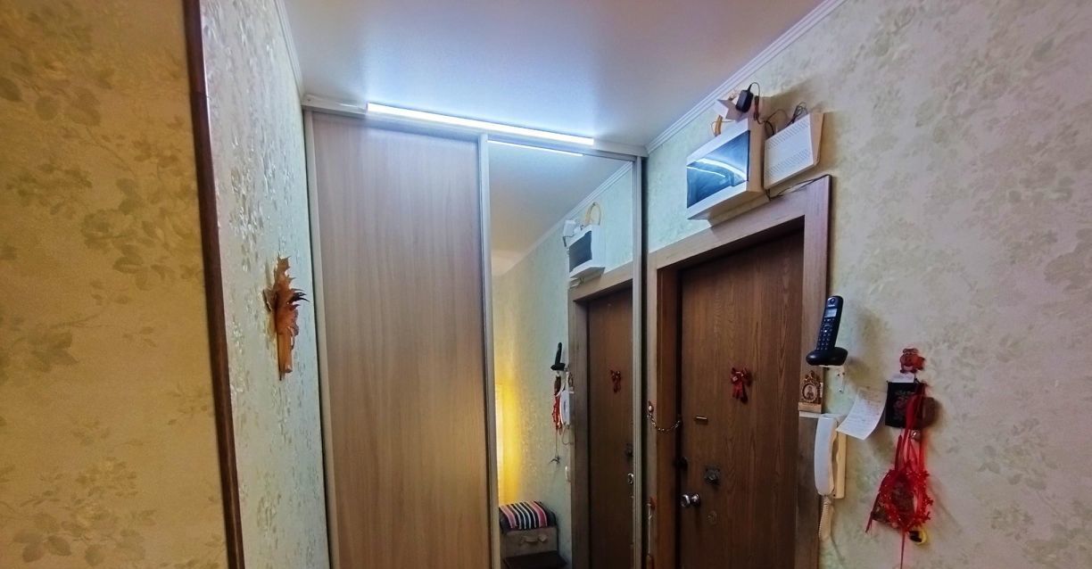 В прихожей вместительный трёхстворчатый шкаф-купе, зеркало, полки, домофон.
