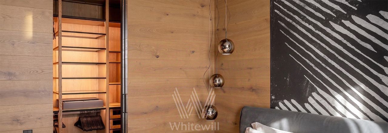 Спланирована кухня-гостиная, мастер-спальня с гардеробной, санузел, прихожая с системой хранения. Кухонная зона укомплектована техникой, включая посудомоечную машину с авто-открытием, винный шкаф, установлен смеситель с функцией моментального кипятка. Гостиная оборудована домашним кинотеатром Dolby Atmos с акустикой Focal, KEF и Bowers & Wilkins, а также телевизором Samsung. Санузел оформлен в концепции спа-пространства: душевая с тропическим душем, унитаз с функцией биде, подогрев зеркала и пола, встроенный iPad и акустика KEF. В гардеробную интегрирована панель терапии красным светом Joovv.