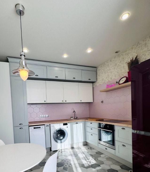 На кухне и в комнате установлена мебель, а также имеется вся необходимая техника: кондиционер, холодильник, посудомоечная машина, телевизор и стиральная машина.