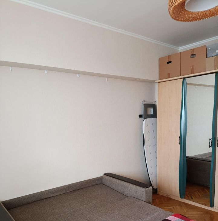 Большая застекленная лоджия с двумя шкафами для хозяйственных нужд. Выход на лоджию из комнаты и из кухни. Санузел раздельный.