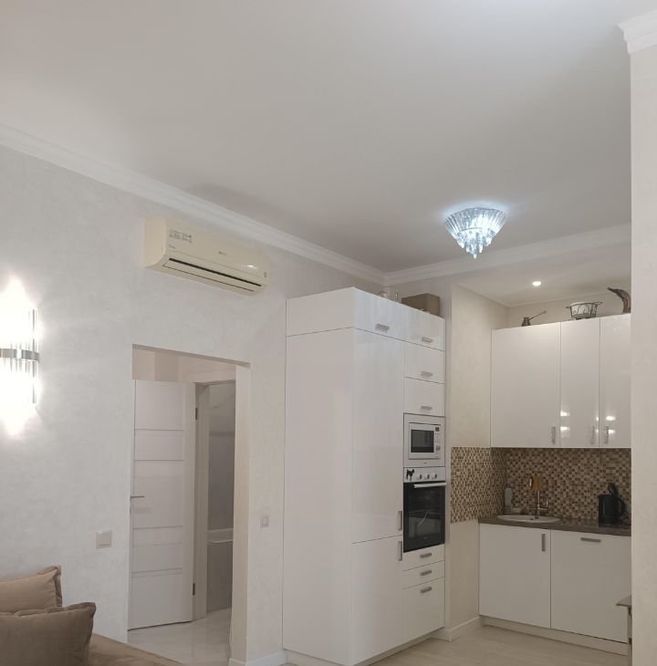 Квартира полностью готова к проживанию: выполнен качественный евроремонт, все комнаты меблированы. На кухне есть вся необходимая техника — холодильник, посудомоечная машина, а также кондиционер для комфортного проживания в жаркие дни. В комнате есть телевизор и стиральная машина. Санузел совмещенный, с ванной. Жилье идеально подойдет для тех, кто ценит комфорт и удобство в быту.