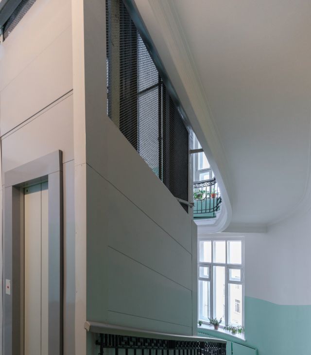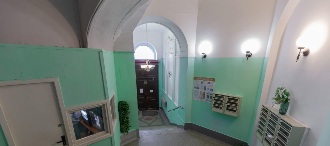 Чистый и ухоженных подъезд после капитального ремонта и реставрации с новым лифтом и консьержем.