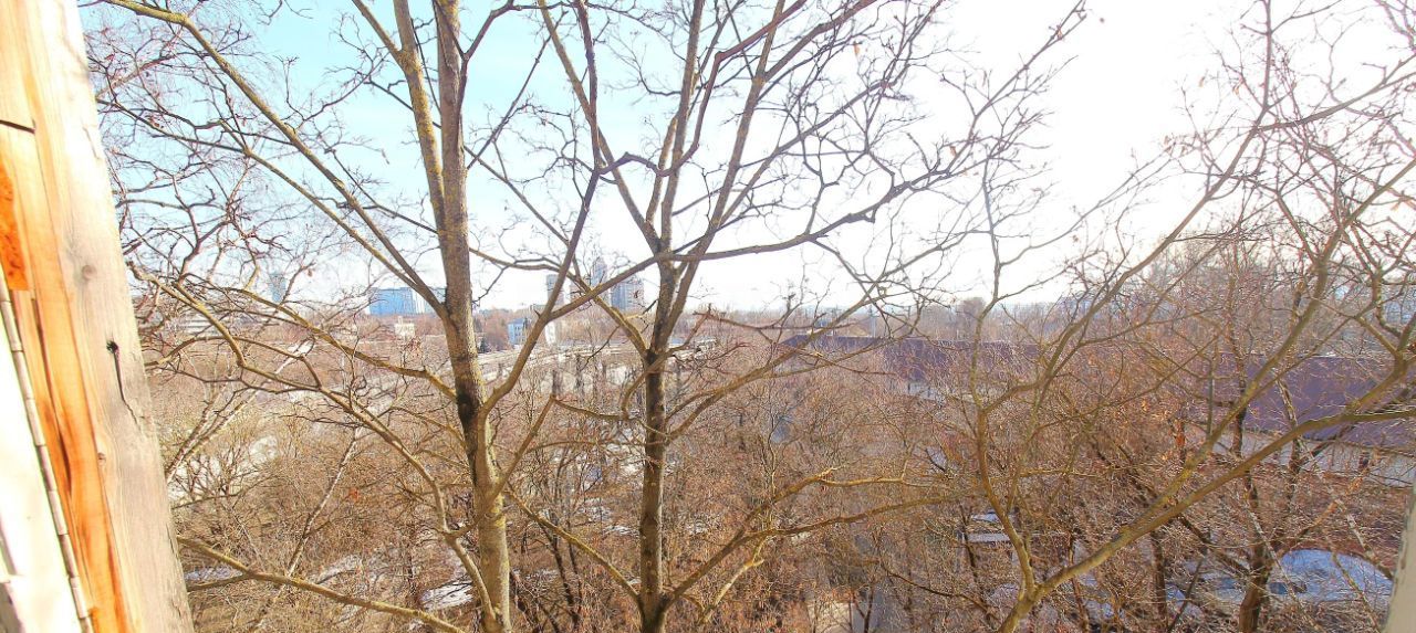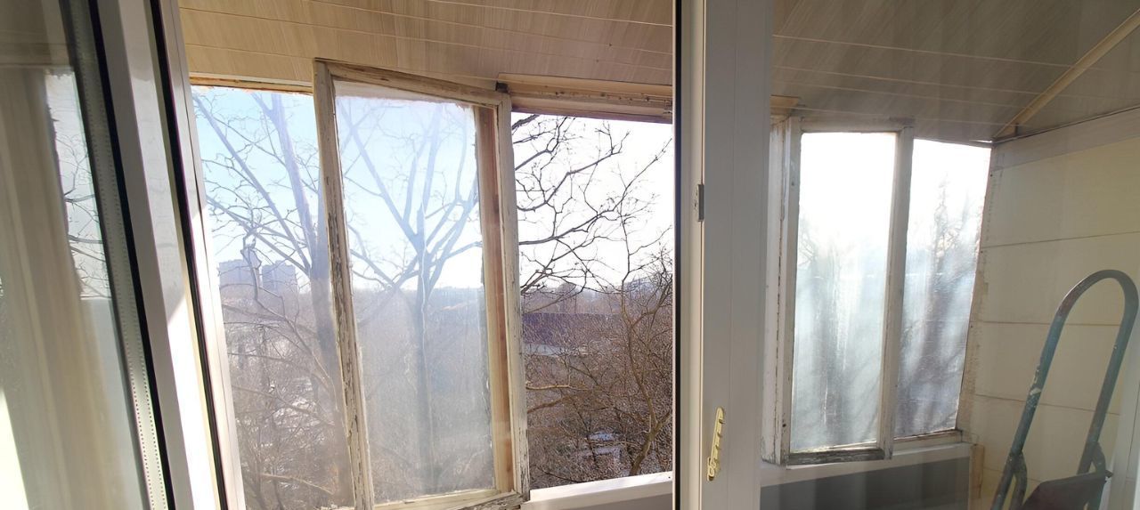 Застекленный балкон с комнаты. Окна выходят на юго-запад.Перед окнами верхушки деревьев, летом будет зелено.