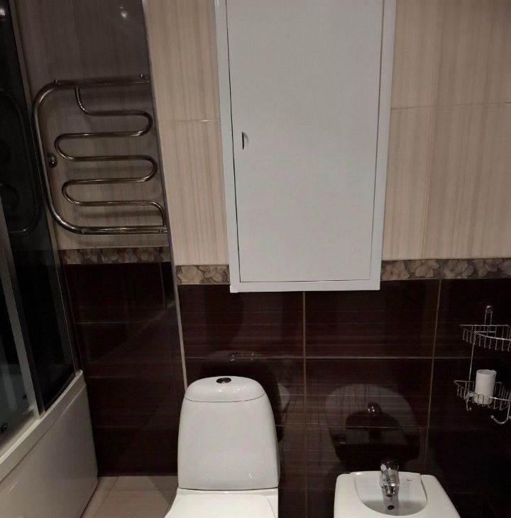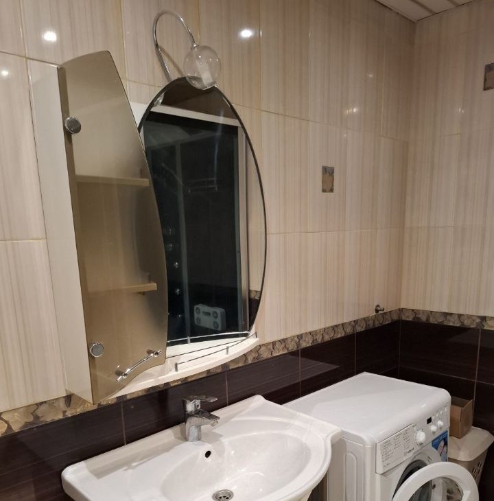 Ванная комната: стиральная машина, душевая кабина с ванной, биде.