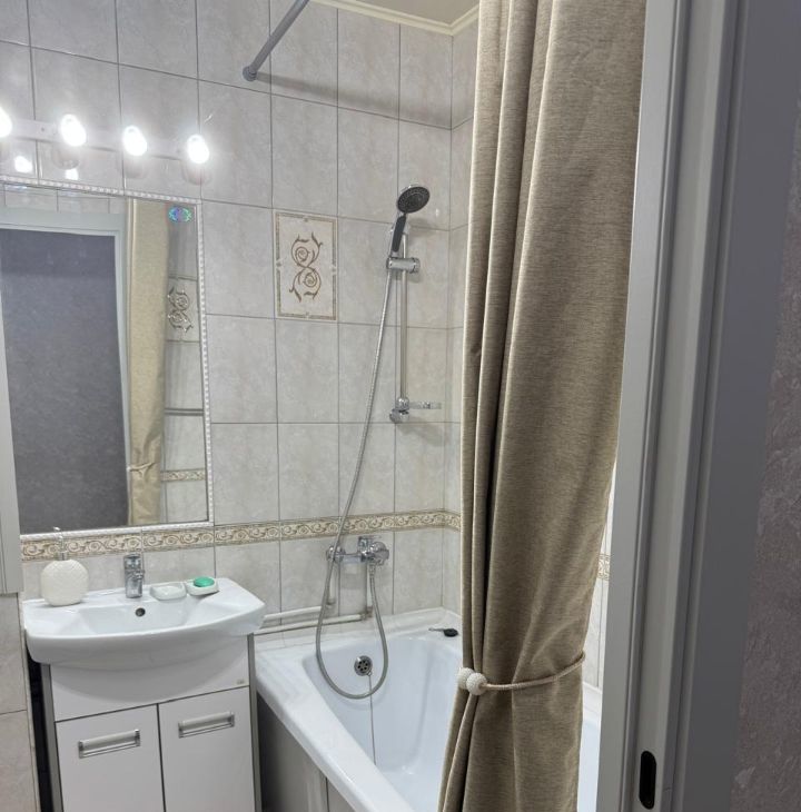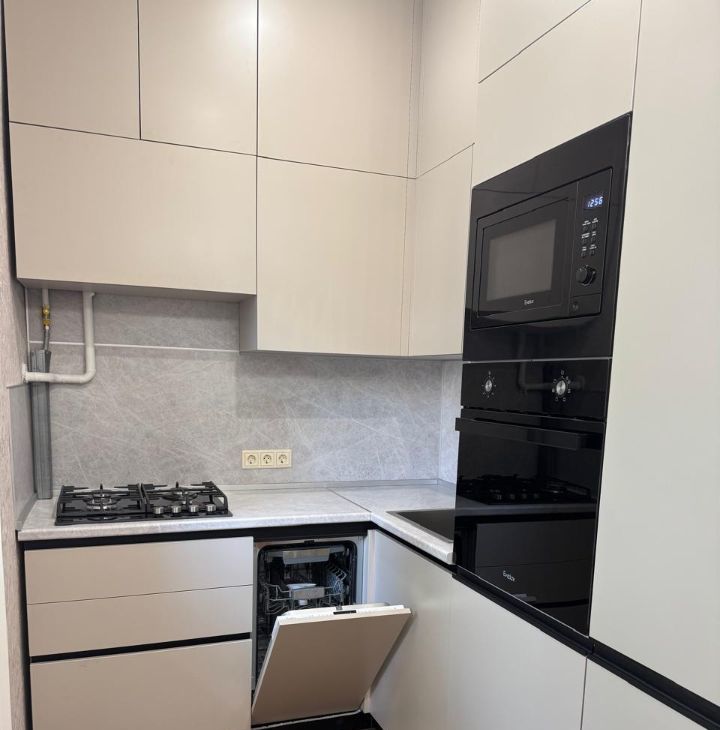 Предлагаем вашему вниманию чудесную однокомнатную квартиру, в которой недавно сделан ремонт. Вся мебель новая. Встроенная кухня, со встроенной техникой (посудомоечная машина, микроволновая печь, духовой шкаф, варочная газовая панель). Из кухни выход на балкон. В комнате двуспальная кровать, большой шкаф, тумба под телевизор, телевизор. Ощущение простора, т.к. коридор плавно перетекает в кухню, дверей нет. Санузел совмещенный с ванной. Очень удачное расположение дома, на тихой улице.