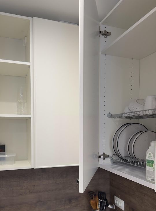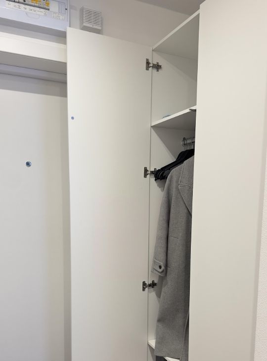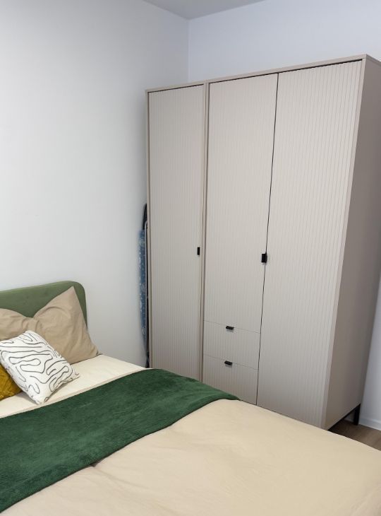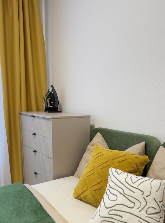 Спальня: кровать с подъёмным механизмом (дополнительное место для хранения), вместительный шкаф и комод, ручной пылесос, гладильная доска с утюгом и складная сушилка.