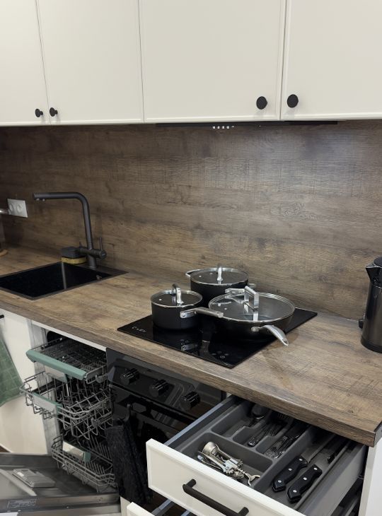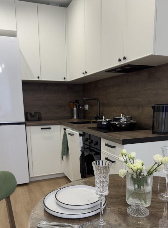 Кухня: оборудована всей необходимой техникой: холодильник, варочная панель, посудомоечная машина, чайник, духовой шкаф, вытяжка, посуда, приборы.
