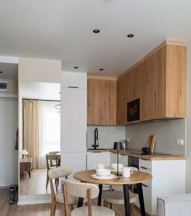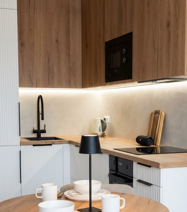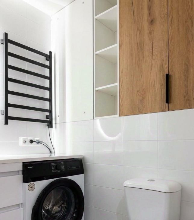 В квартире есть вся необходимая техника: встроенный холодильник, посудомоечная машина, микроволновая печь, духовой шкаф, индукционная плита, стирально-сушильная машина, телевизор. Также установлен фильтр для воды.