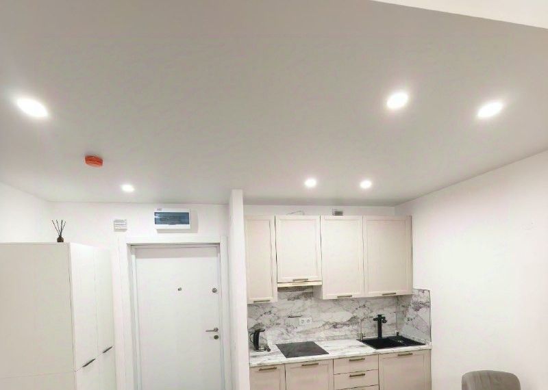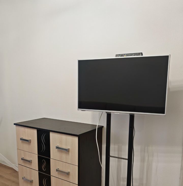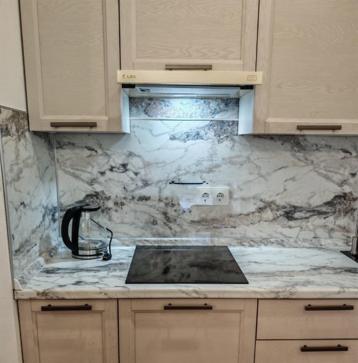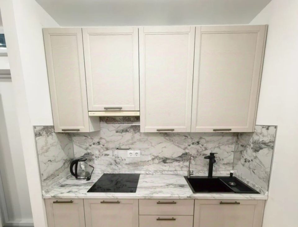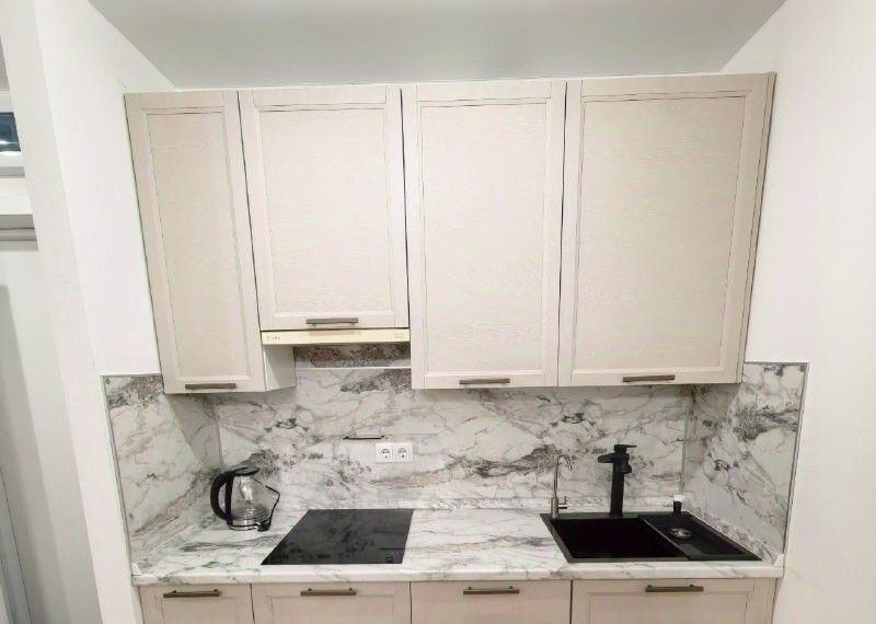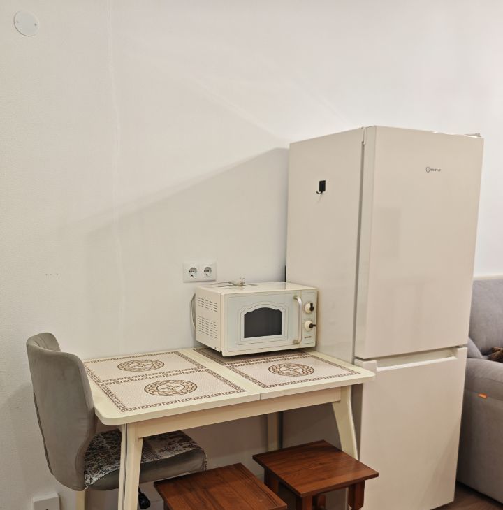 Техника: телевизор, холодильник, стиральная машинка, микроволновая печь, индукционная варочная панель, вытяжка.
