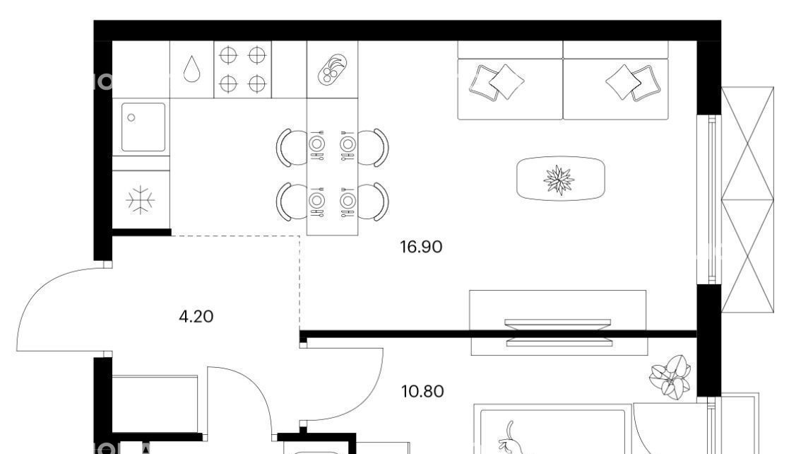 Стильная дизайнерская квартира с французским балконом. Большие окна выходят на тихий закрытый двор. Кухня-гостиная (17 кв м) и спальня (11 кв м) в районе с развитой инфраструктурой и удобной траспортной развязкой.