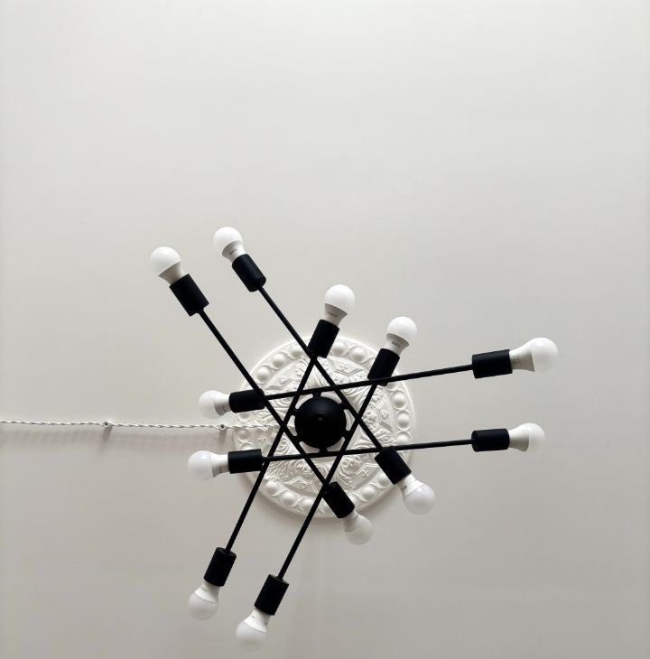 Белые стены служат спокойным фоном и отражают свет, а внешняя ретро-проводка добавляет пространству и шарм и легкий индустриальный акцент.
