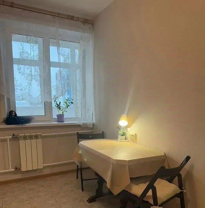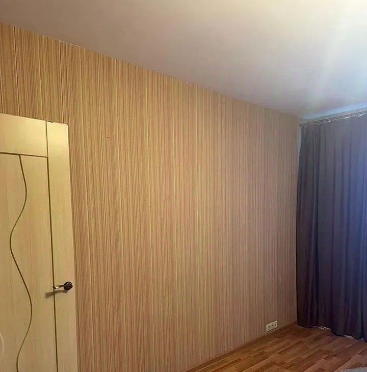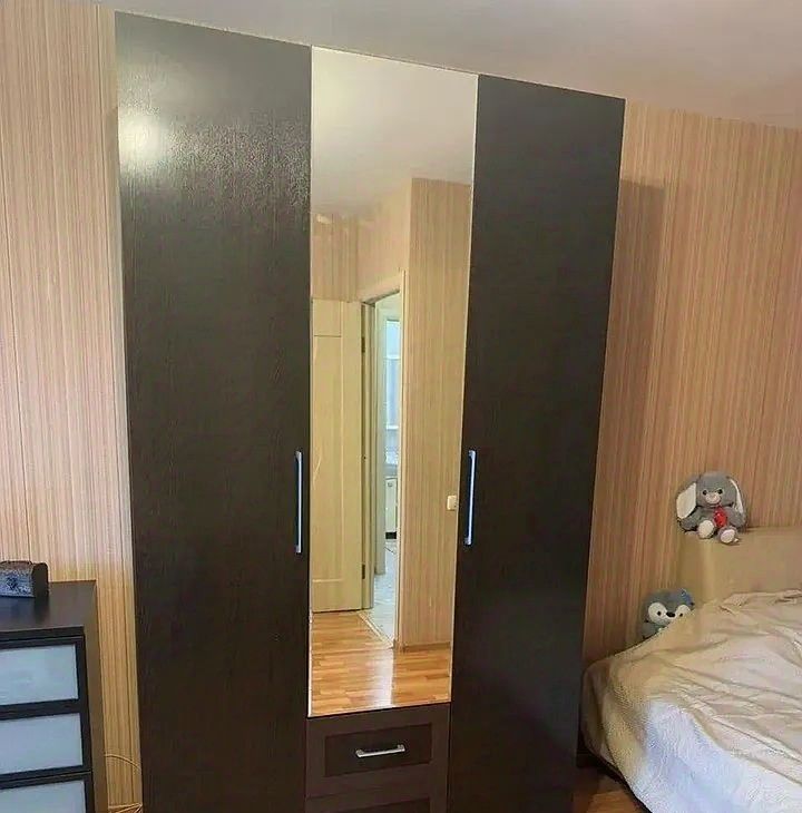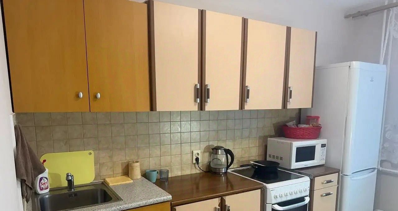 В квартире выполнен косметический ремонт. Просторная комната оборудована шкафами и диваном. Из мебели также имеется обеденный стол и стулья. Кухня оснащена необходимой бытовой техникой, включая холодильник, плиту и микроволновку.