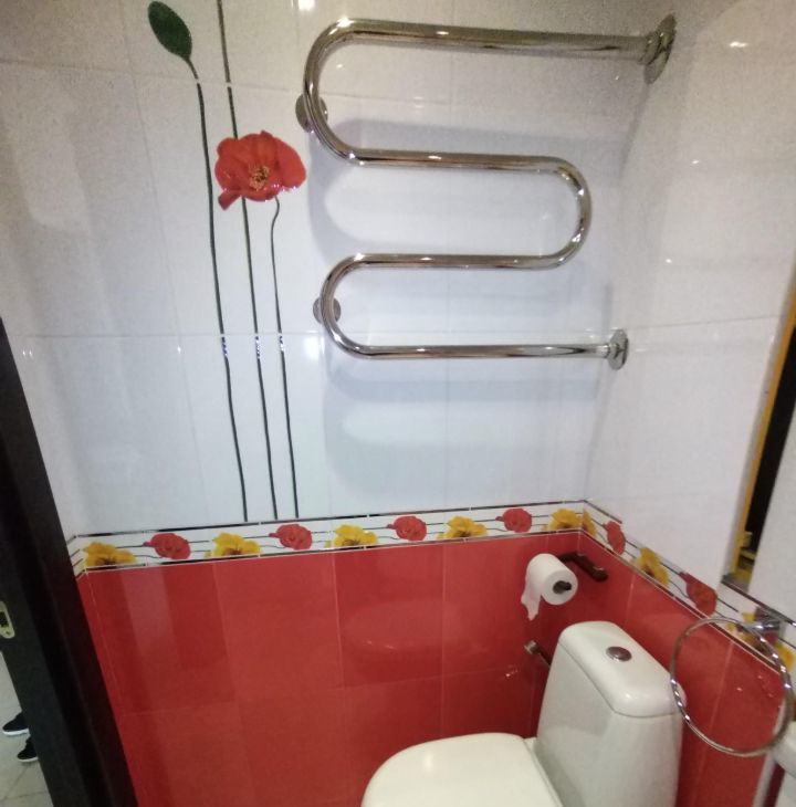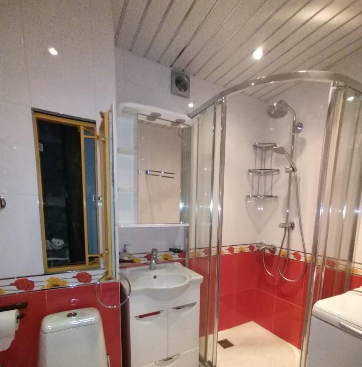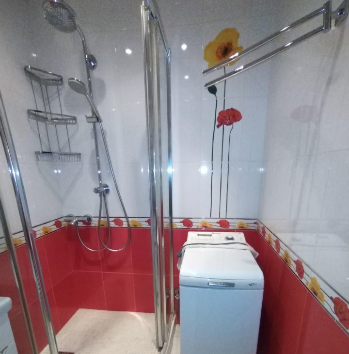 Сан.узел совмещен, в современной плитке до потолка, душевая кабина, стиральная машинка автомат.