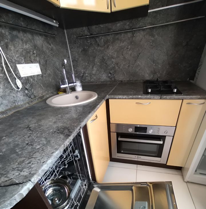 Кухня -стол + 2 стула + кресло, современный кухонный гарнитур под единой столешницей, газовая плита, духовой шкаф с функцией СВЧ, ПММ, 2-х камерный холодильник.