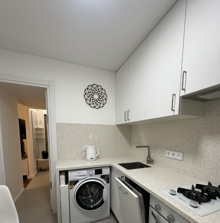Кухня: встроенная кухня со всей необходимой бытовой техникой: посудомоечная машина, стиральная машина, духовой шкаф, варочная панель, вытяжка, встроенный холодильник и микроволновая печь. Есть все для комфортного проживания, включая новую посуду.