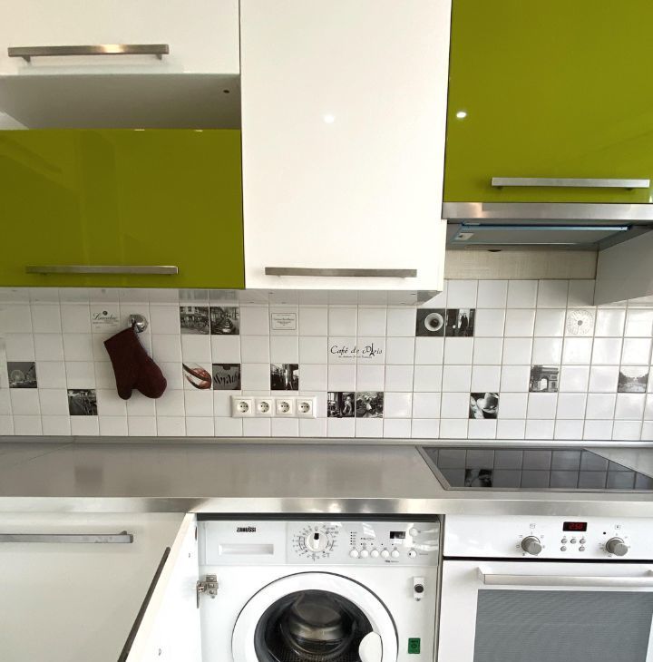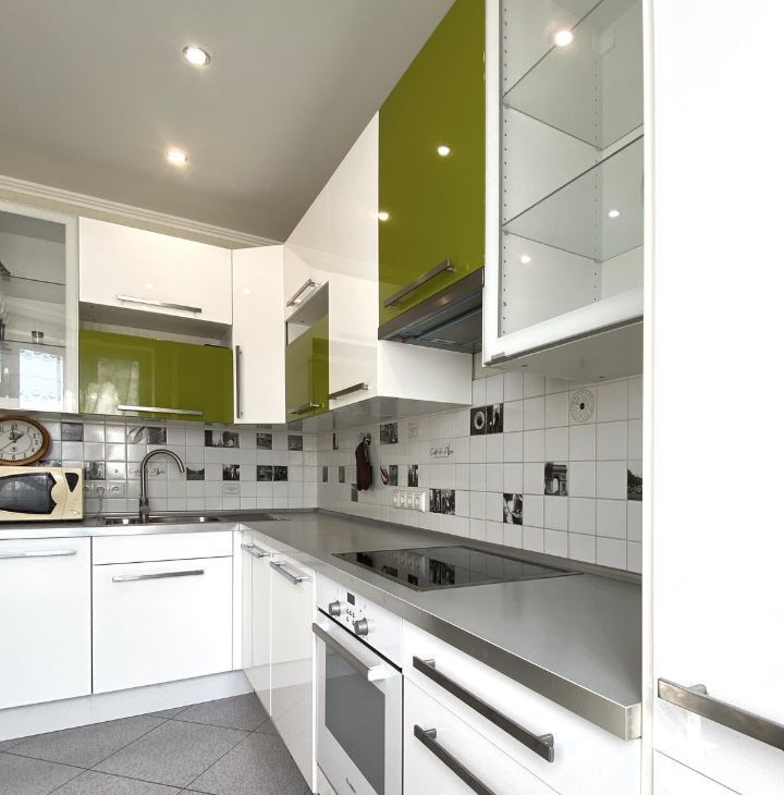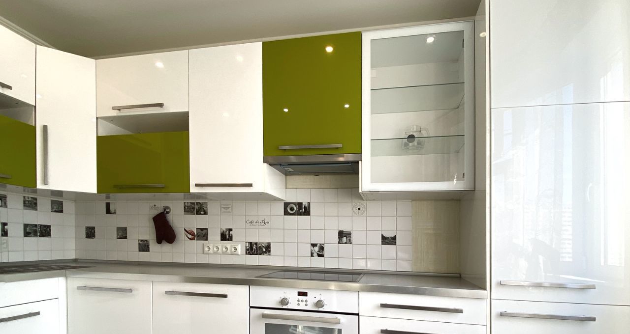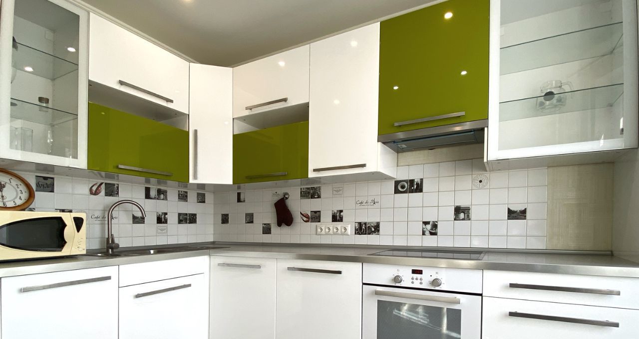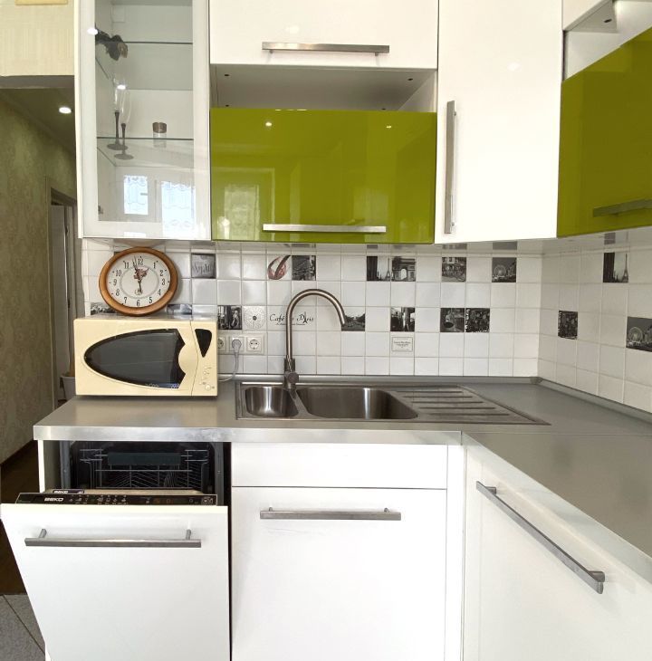 Ну кухне установлен угловой кухонный гарнитур со встроенной техникой: