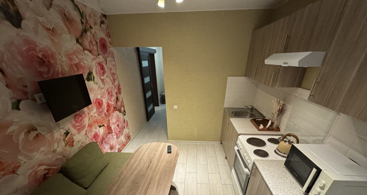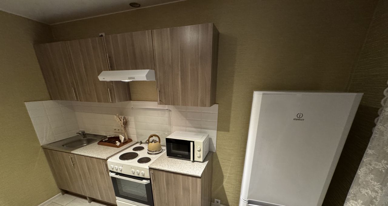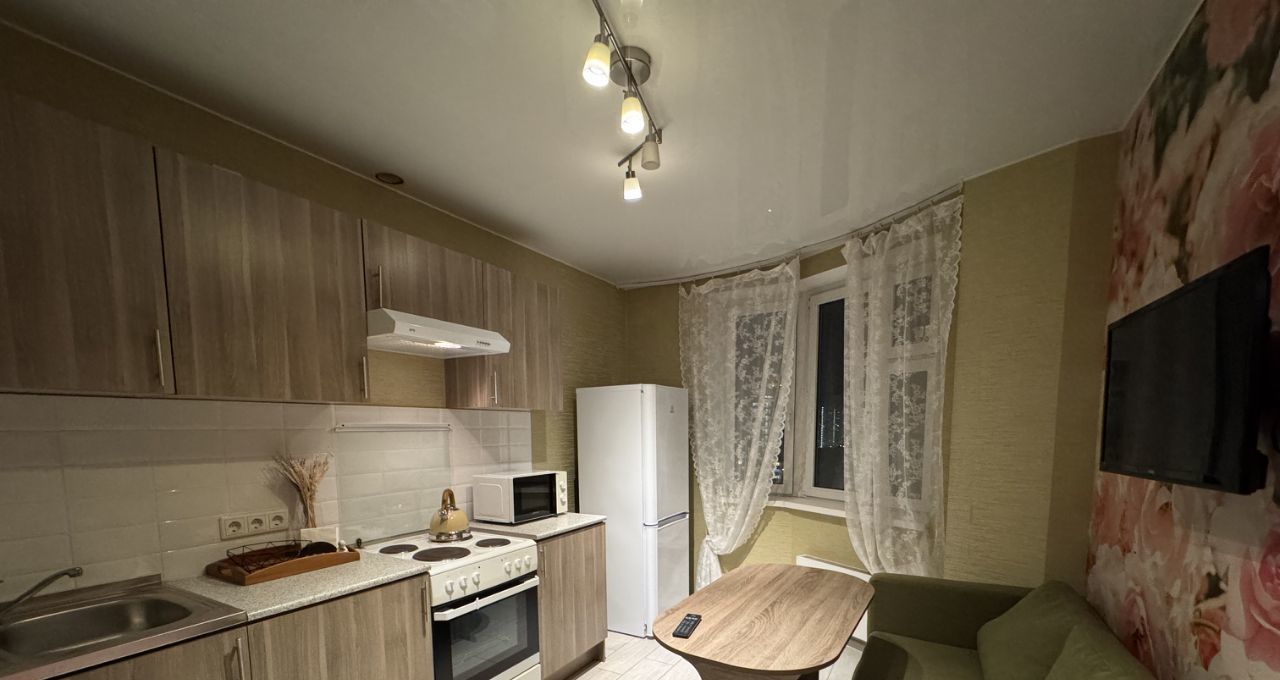 Кухня оборудована плитой, вытяжкой, двухкамерным холодильником и ЖК телевизором.
