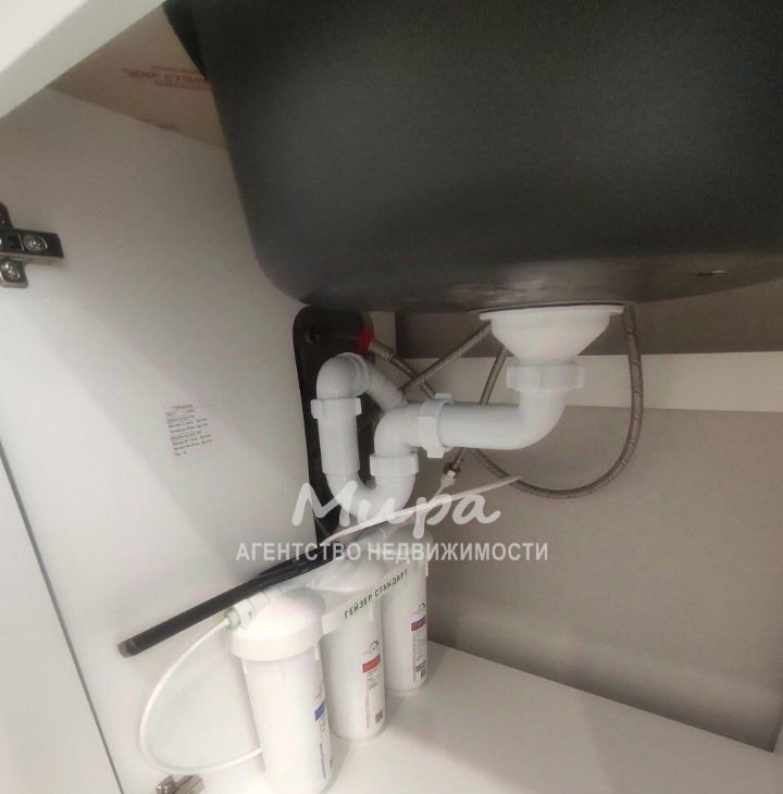 На кухне: новый кухонный гарнитур, варочная панель, духовой шкаф, вытяжка, холодильник, фильтр воды, микроволновая печь, посуда для приготовления и принятия пищи.