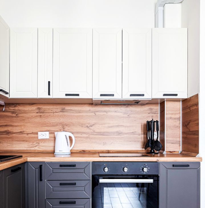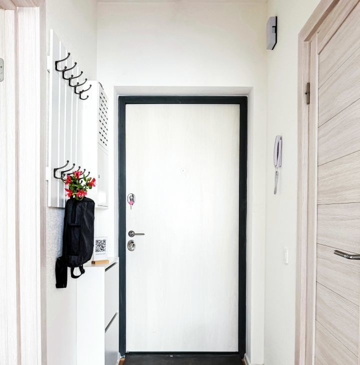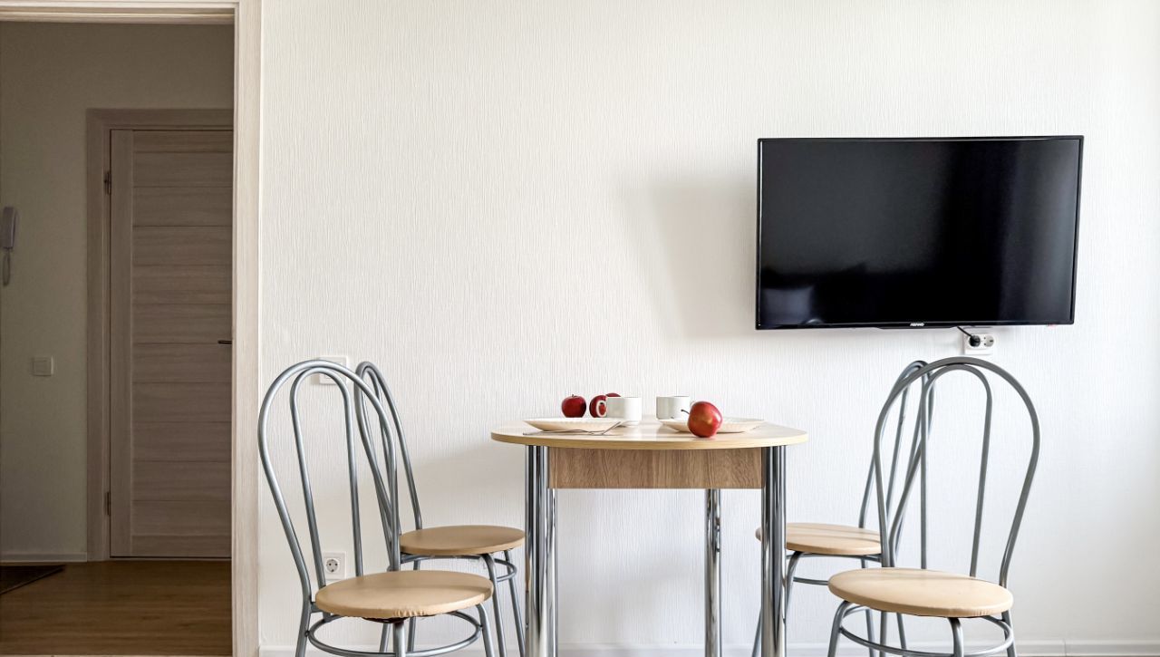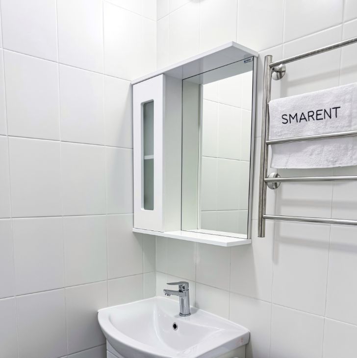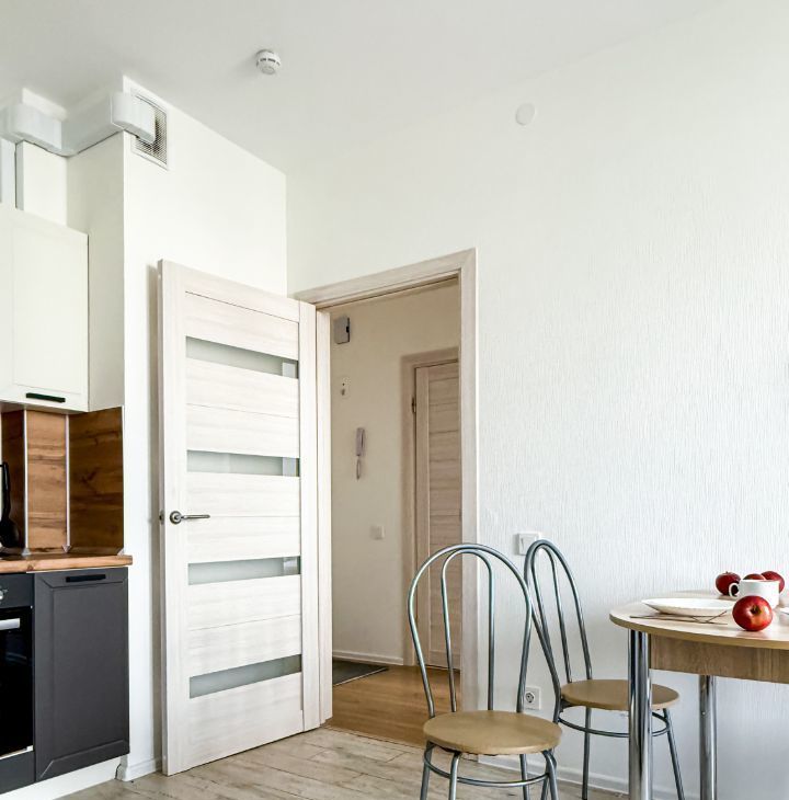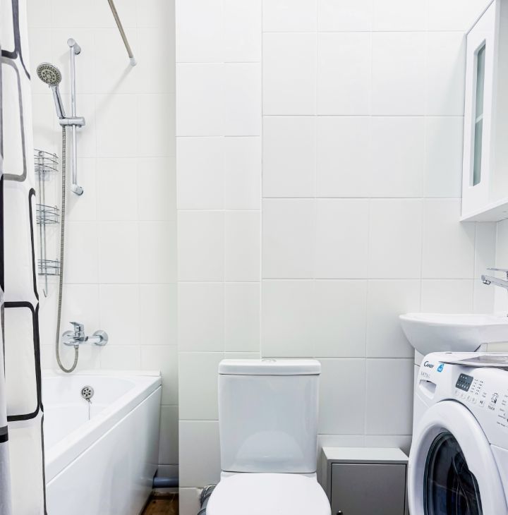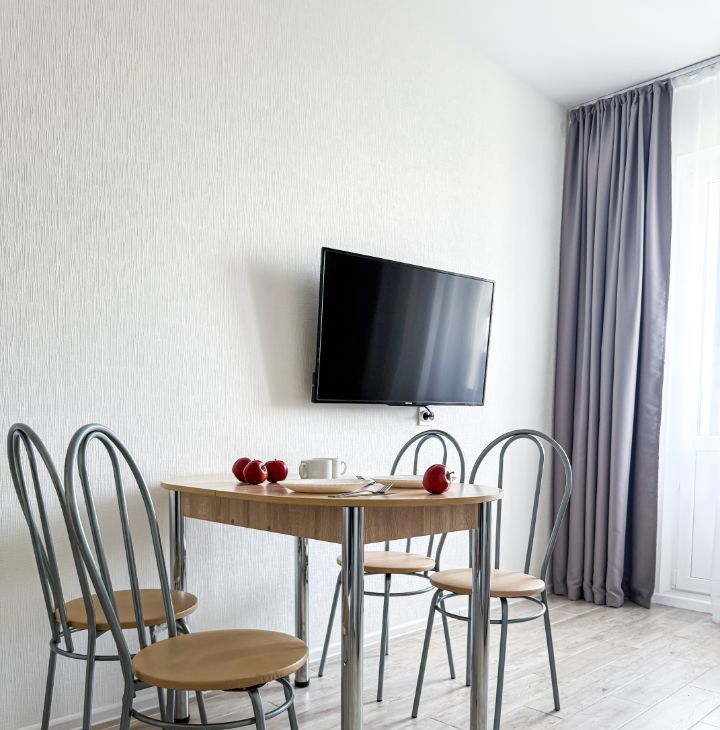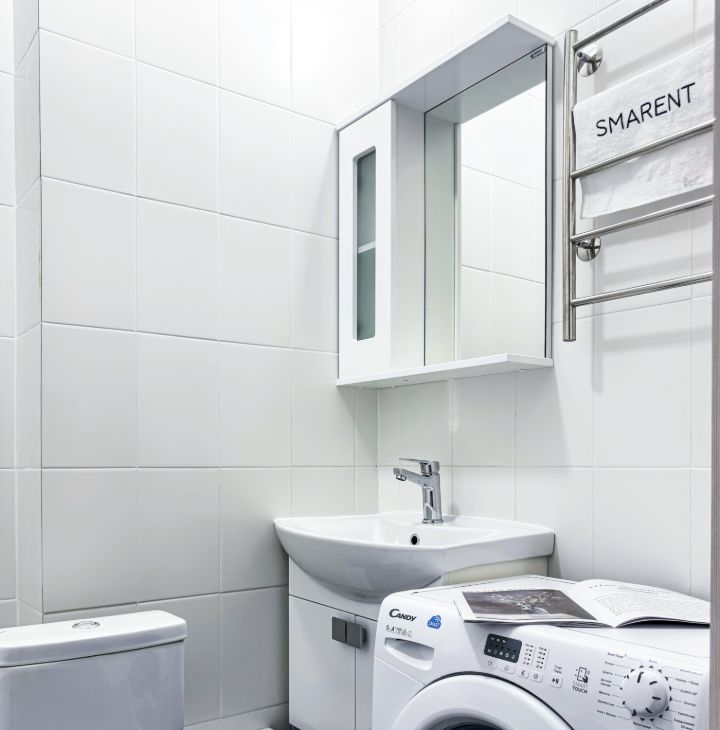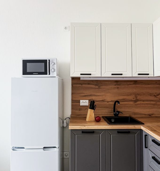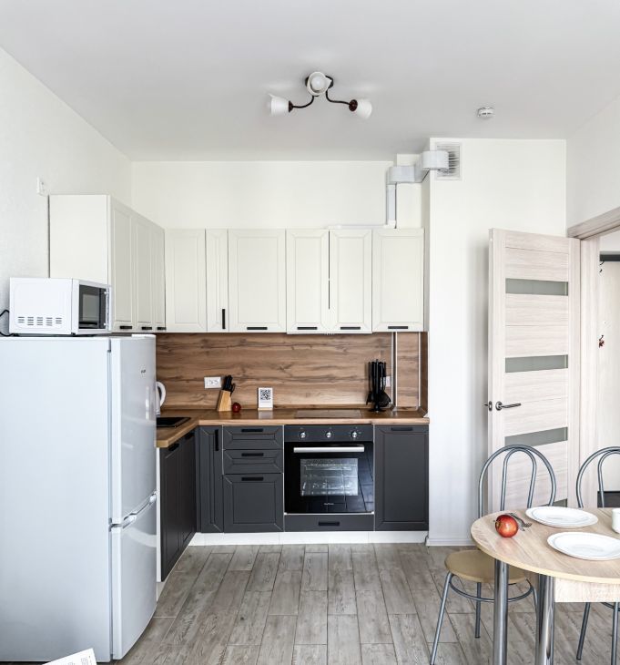 Бытовая техника: телевизор, стиральная машина, холодильник, микроволновая печь, варочная панель, духовой шкаф, гладильная доска, утюг, сушилка для одежды, электрический чайник. Есть все необходимое для комфортного и долгосрочного проживания, в т.ч. посуда.