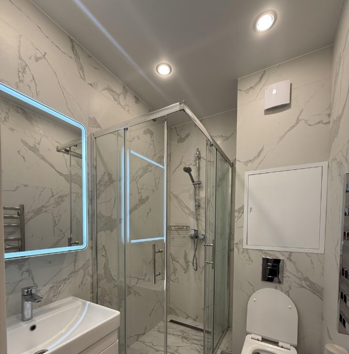 Санузел совмещенный, оборудован душевой кабиной.