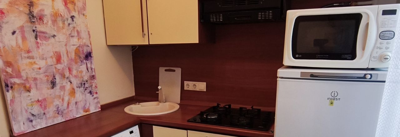 На кухне газовая плита, холодильник, микроволновая печь.