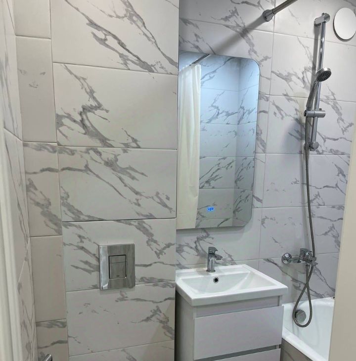 Современный санузел: облицован крупноформатным керамогранитом под мрамор, оснащен инсталляцией, подвесной тумбой и стильным зеркалом с подсветкой.