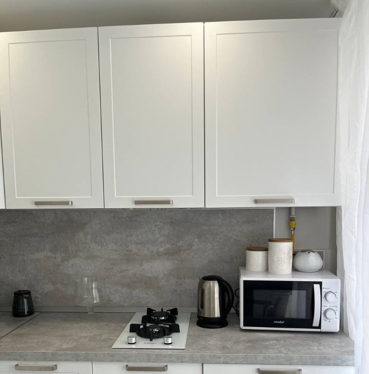 Светлая кухня: Полностью укомплектована техникой. Белоснежные фасады и столешница "под бетон" — стильно и практично. Здесь есть все: от посудомойки и духового шкафа до чайника и посуды