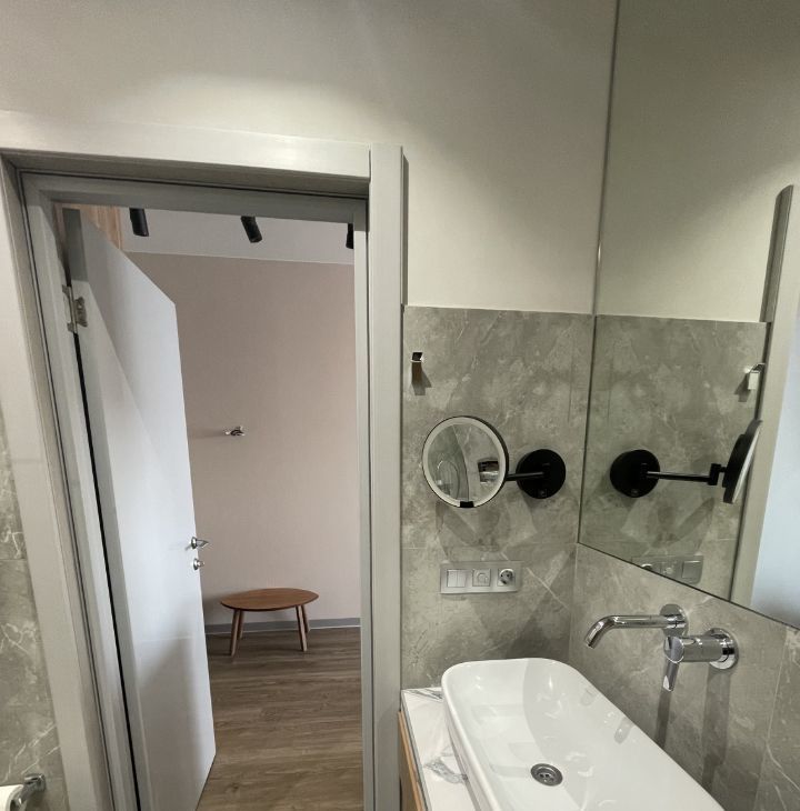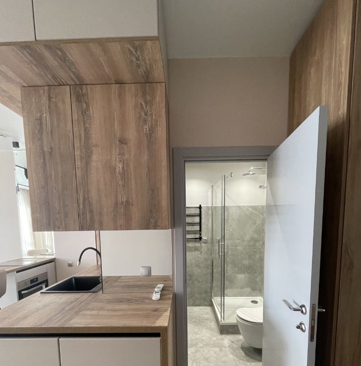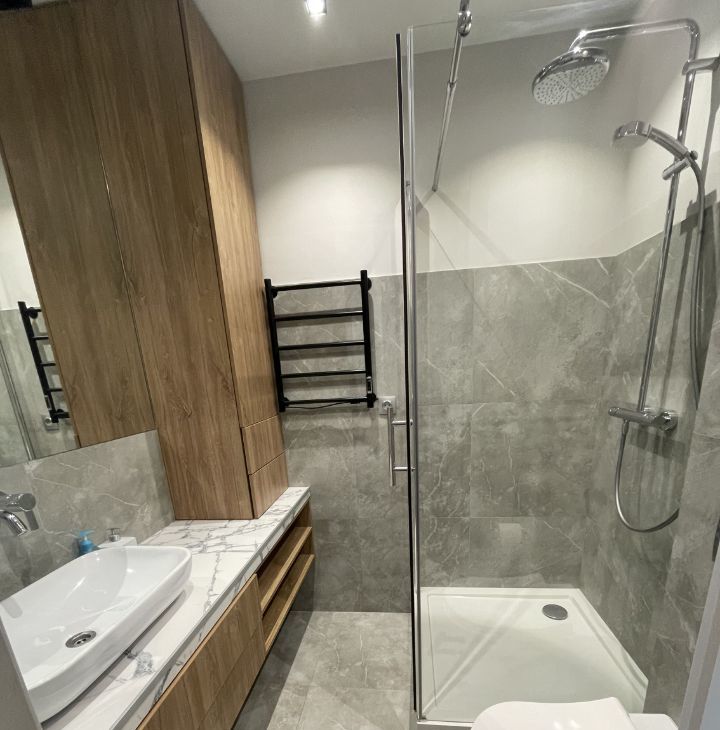В сан. узле есть шкаф для мелких вещей , душевая с качественной сантехникой.