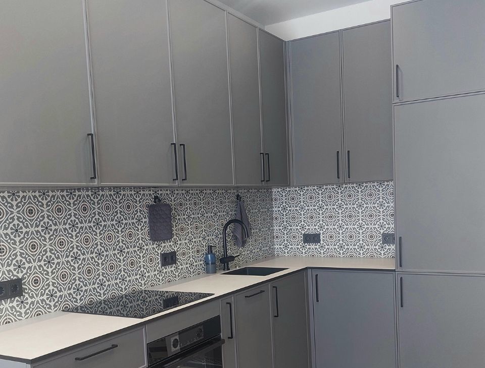 Кухня оснащена варочной панелью и духовым шкафом, посудомоечной машиной и встроенным холодильником, имеется набор посуды на 6 персон. Установлен фильтр для воды с обратным осмосом и измельчитель отходов.