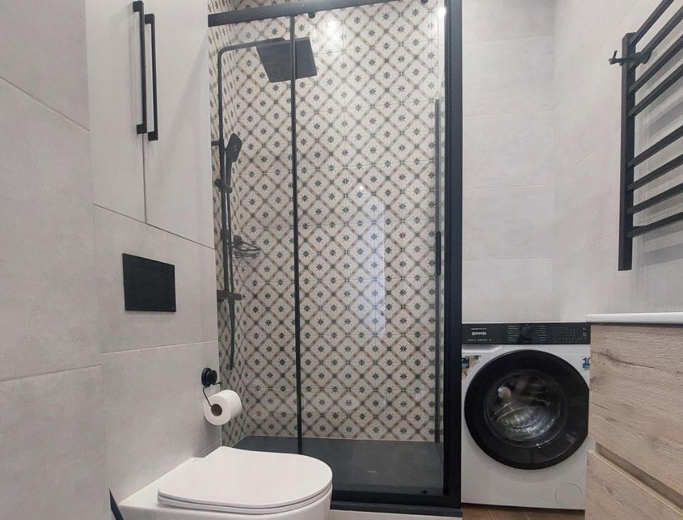 Уютная просторная ванная комната. Установлена стиральная машина, гигиенический душ.