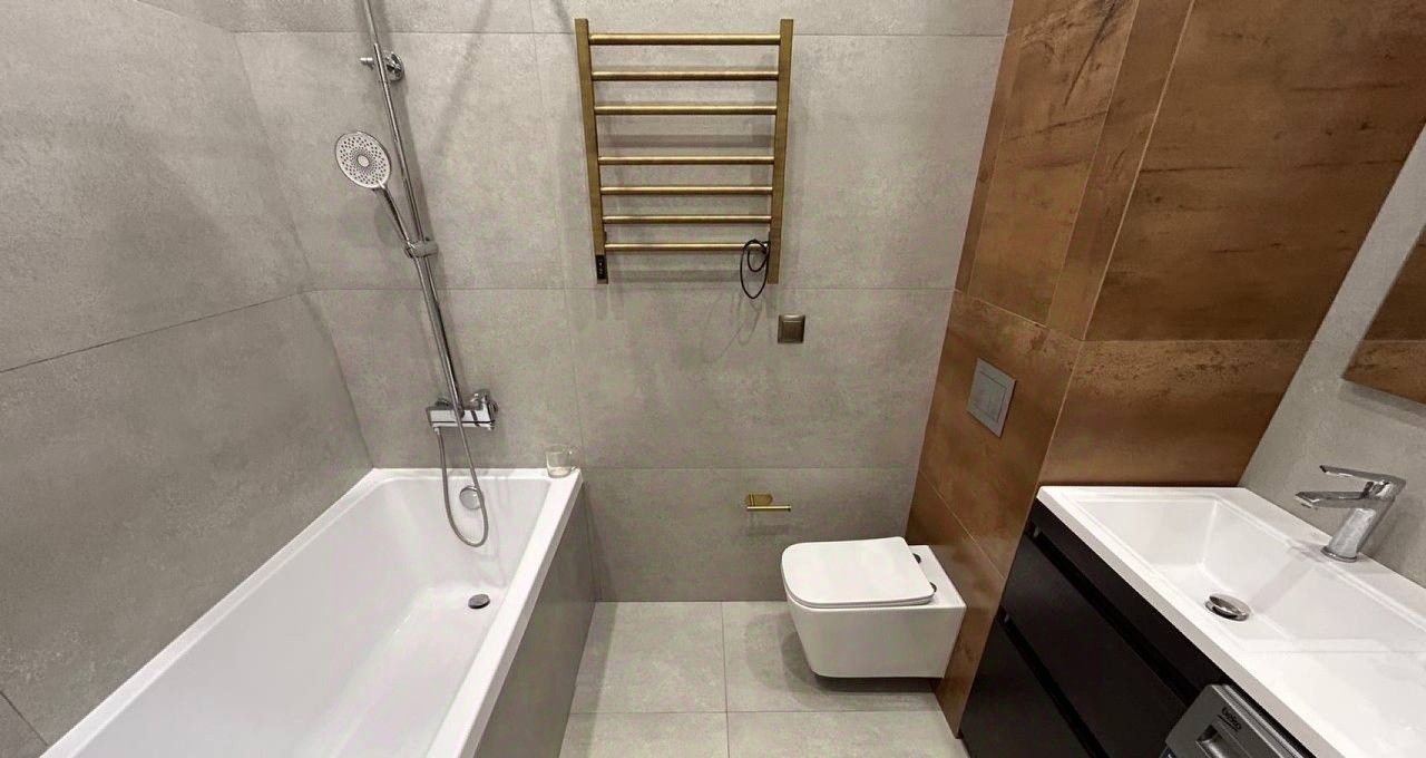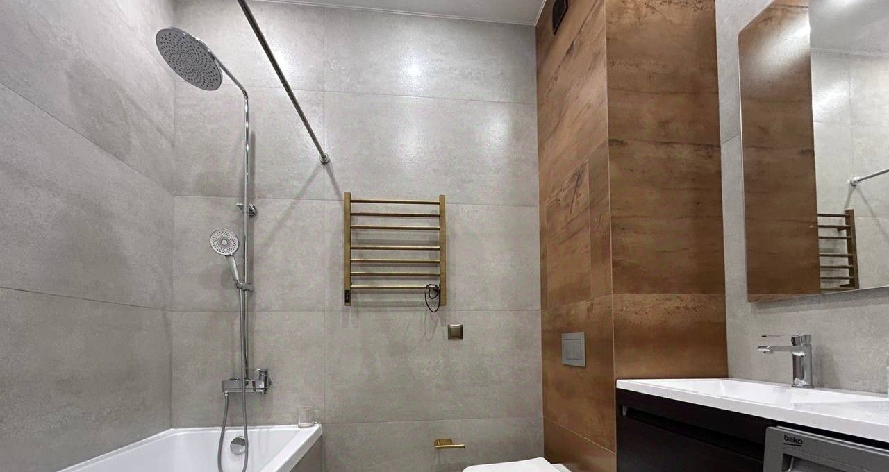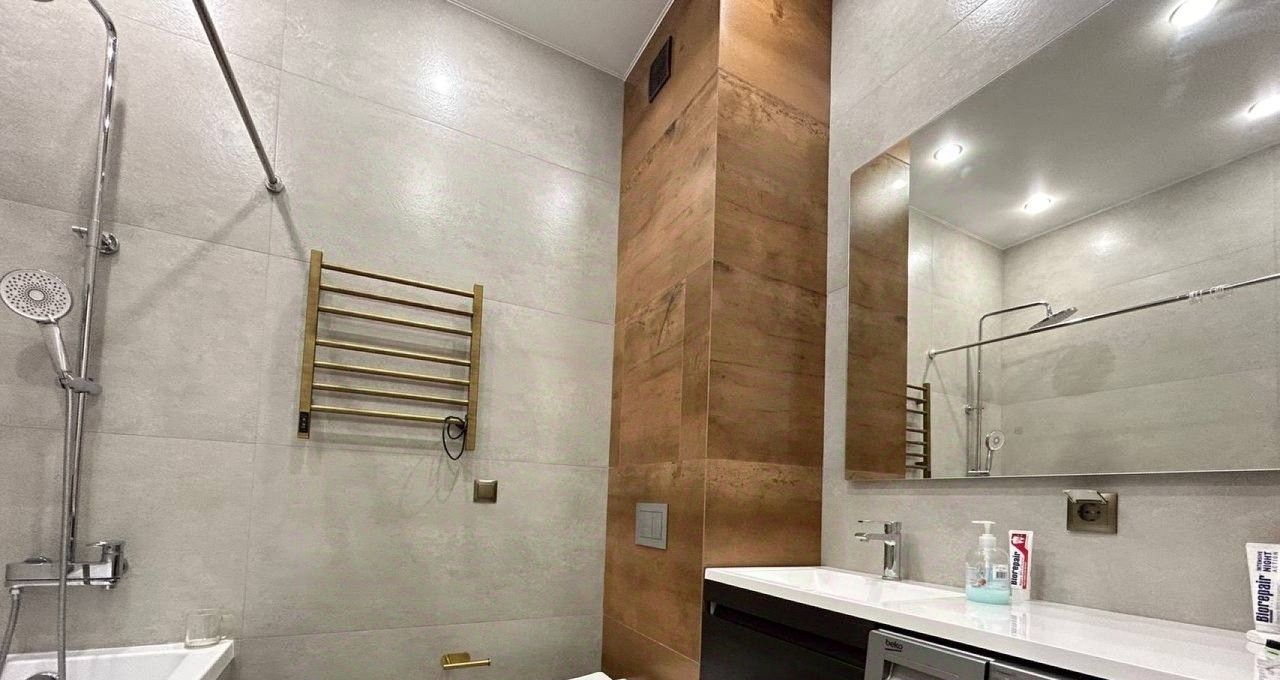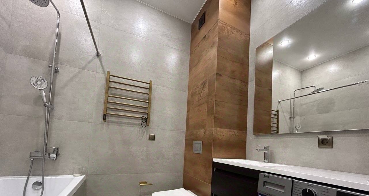 Стильный санузел с ванной, имеются стиральная и сушильная машины, тёплые полы. Имеется вся необходимая мебель и техника для вашего комфорта: большая удобная кровать 180х200, раскладной диван, посудомоечная машина, микроволновая печь, холодильник, духовой шкаф, кондиционер, два телевизора.