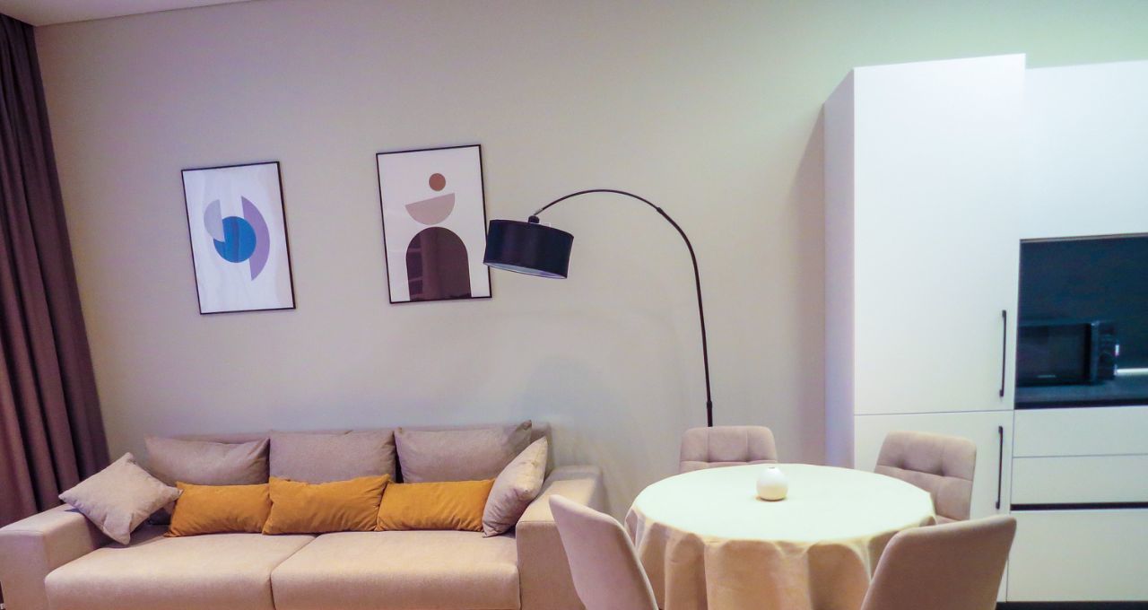 ИНТЕРЬЕР КВАРТИРЫ : Здесь вас ждут стильная мебель и качественная техника, которые создадут уютную атмосферу и позволят вам сразу же насладиться жизнью в новом доме. Пространство продумано—удобства и уют в каждом уголке. Квартира выполнена в современном стиле: мягкие пастельные тона, тёплое освещение,. Полностью укомплектована всей необходимой бытовой техникой и мебелью. -гостиная , уютная спальня. ПАНОРАМНЫЕ окна, , теплые полы.