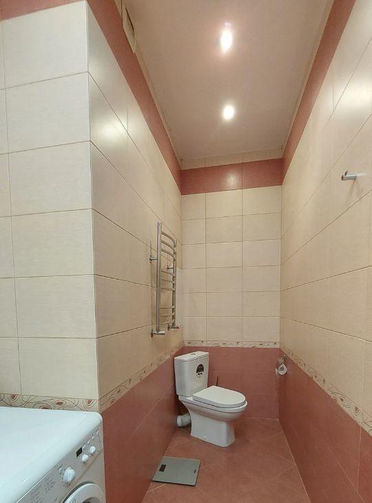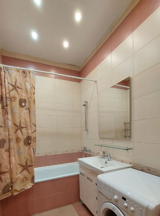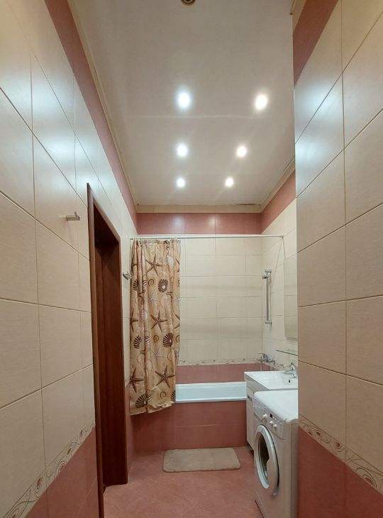 * Большой совмещенный С/У отделан современной плиткой до потолка, натяжной потолок, стиральная машина-автомат.