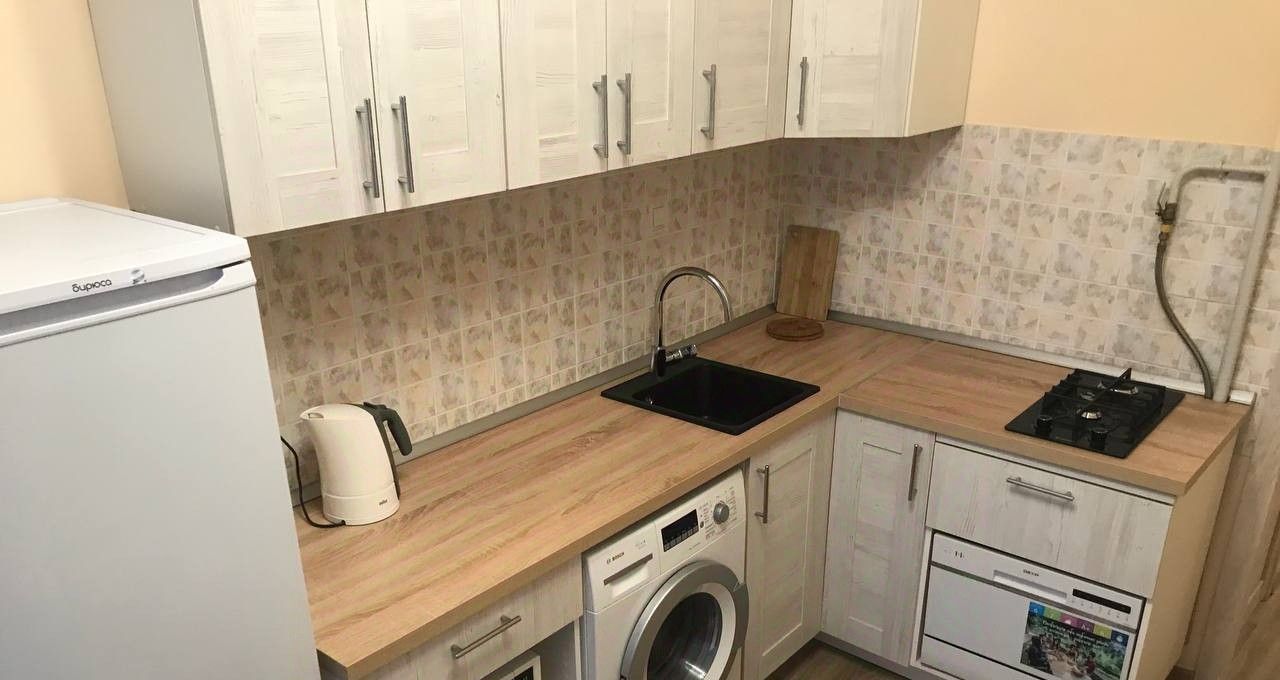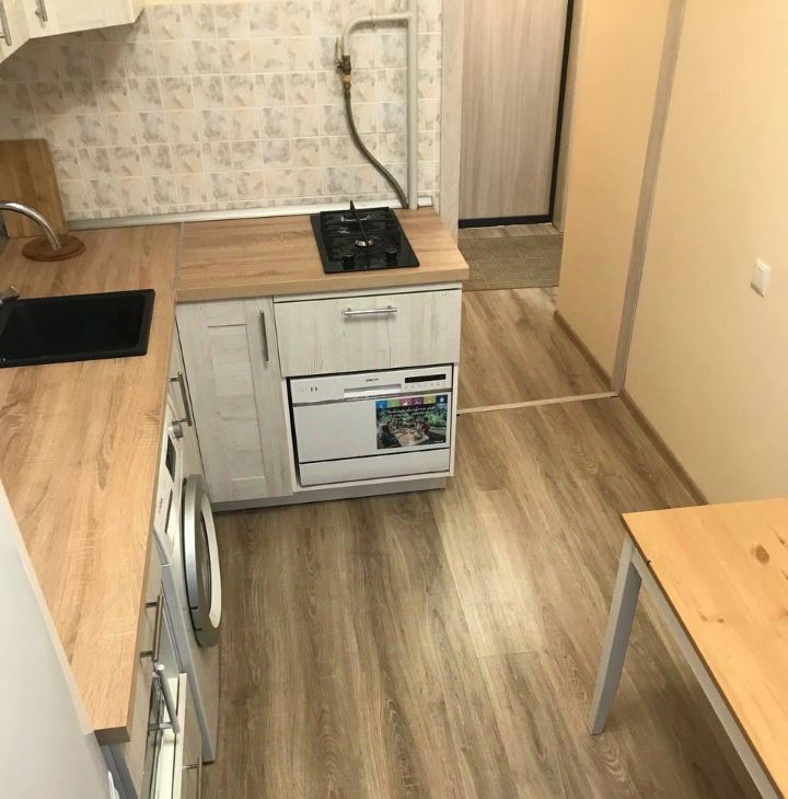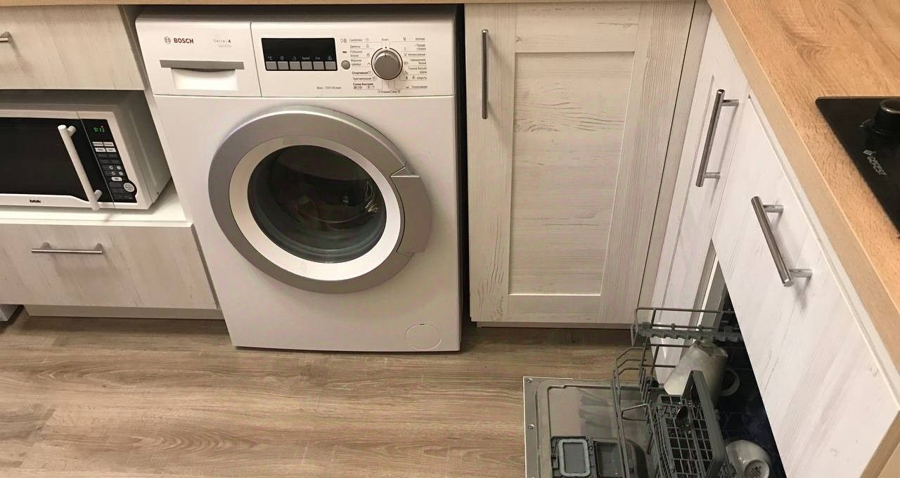 На кухне - мини диванчик , раскладной (полноценное спальное место), посудомойка, стиралка, СВЧ, чайник, холодильник.