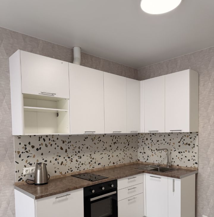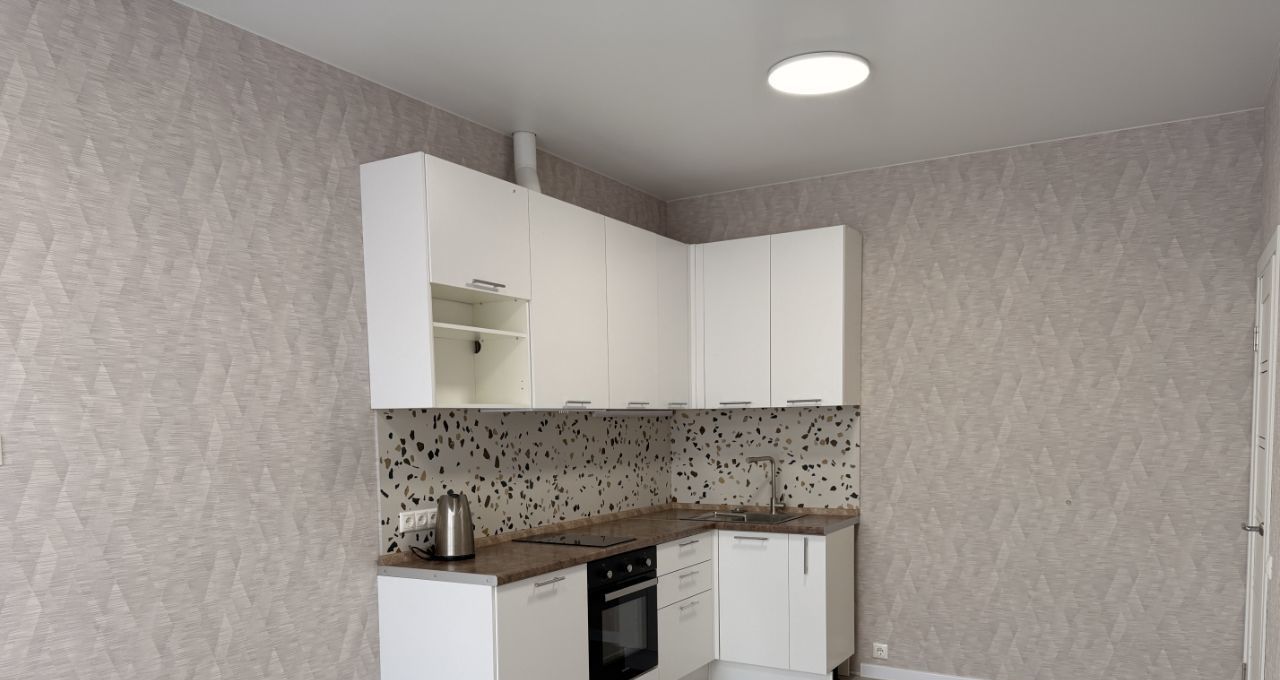 В квартире сделан евроремонт, установлен кухонный гарнитур со встроенной техникой (Индукционная плита, духовой шкаф, вытяжка).