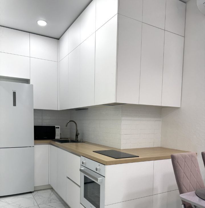 • Просторная кухня, полностью оборудованная современной бытовой техникой, с обеденной и гостевой зоной — здесь удобно готовить и принимать гостей.