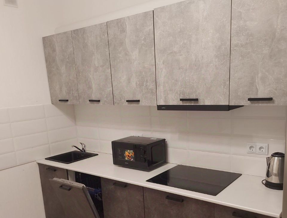 на кухне: встроенная кухня, варочная панель, посудомоечная машина, холодильник, микроволновка.