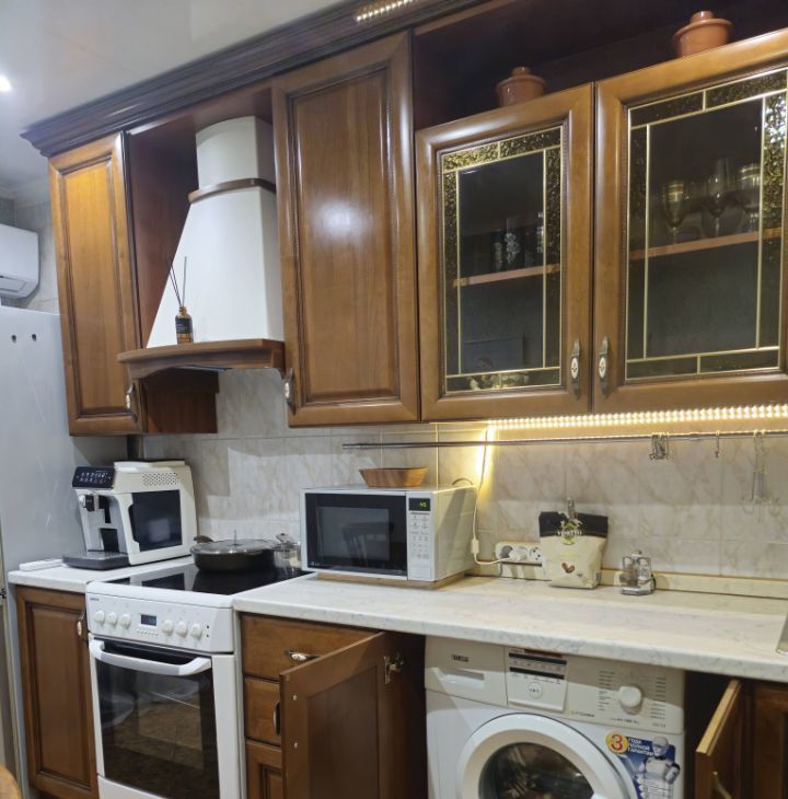 В квартире имеется вся необходимая для проживания мебель и техника : большой шкаф - купе для вещей, кровать , небольшой раздвижной диван, холодильник, стиральная машина, варочная панель , свч, кофе-машина и т.д.