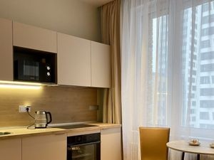 В квартире есть все необходимое для комфортного проживания: обогреватель бойлер (накопительный на 50 литров), фильтр воды, микроволновка, варочная панель, вытяжка на кухне, вытяжка в ванной, теплые полы, системы защиты от протечек нептун, розетка для робота пылесоса, чайник, полный набор столовой и кухонной посуды, столовых приборов, постельное белье, полотенца, одеяла, подушки, холодильник, посудомоечная машина, стиральная машина. Мебель установлена в кухне, в гостиной, в комнате. Из мебели есть диван, высокий матрас - кровать, шкаф, при входе тумба, кухонный стол, стулья. Ванная комната оборудована душевой кабиной. Квартира имеет современный евроремонт, поэтому вам не придется тратить время и деньги на обновление интерьера.