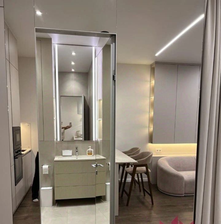Зеркальная поверхность стены создаёт также иллюзию дополнительного пространства.