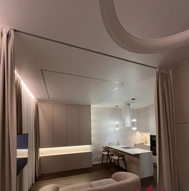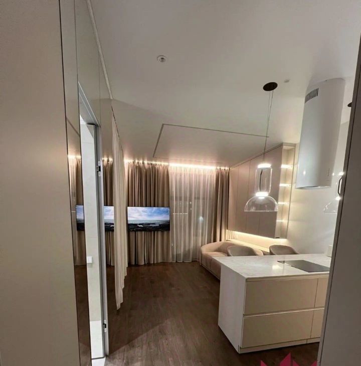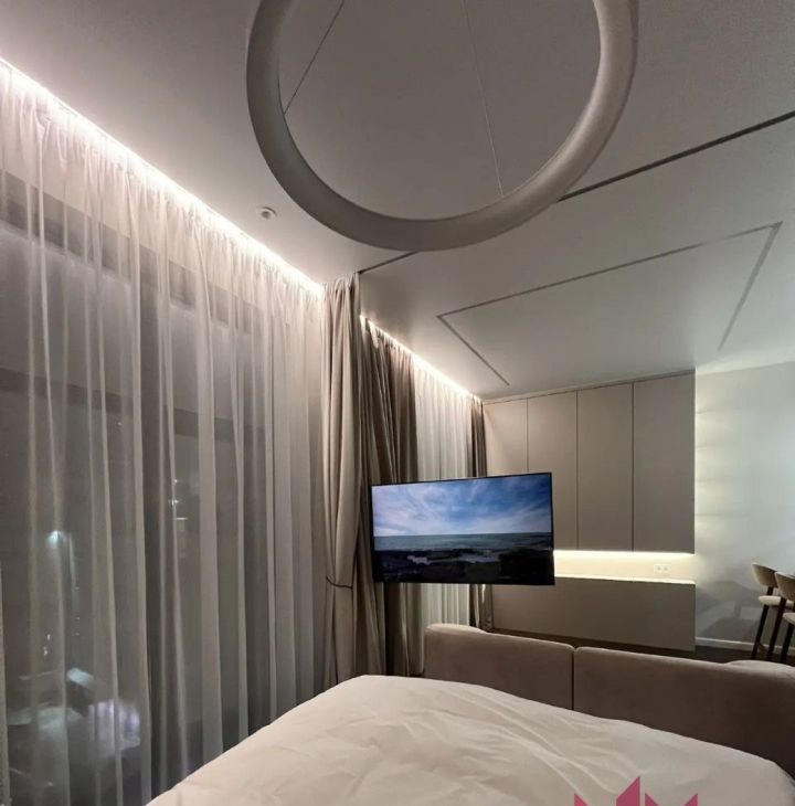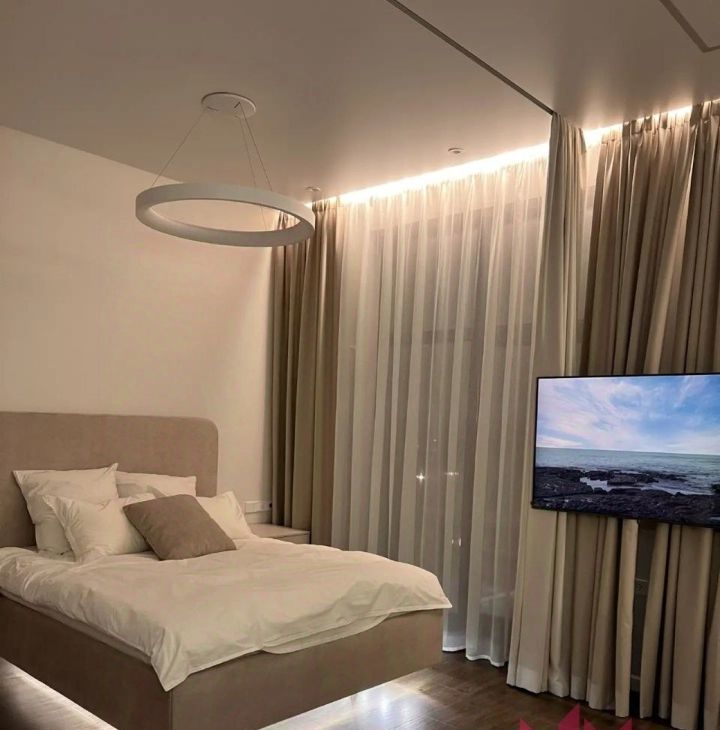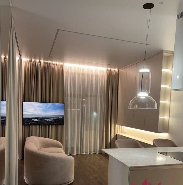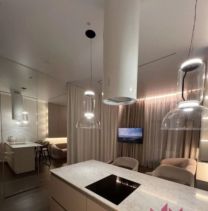 В квартире имеется вся необходимая мебель и техника. Телевизор на длинном кронштейне, можно смотреть его как сидя на кухне, так и развернув его к кровати. Разнообразная система освещения по всей квартире, есть возможность создавать уют и атмосферу релакса.