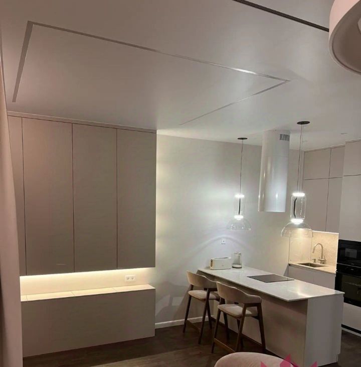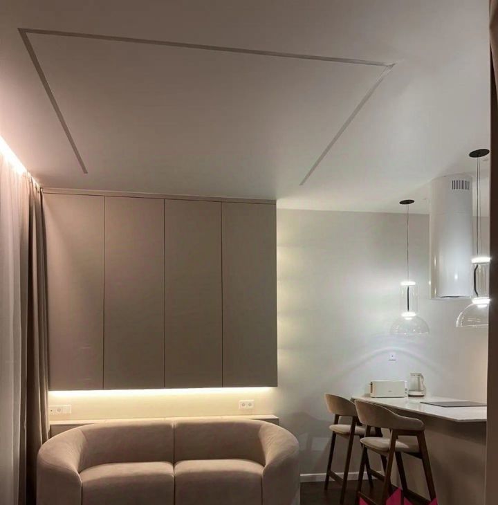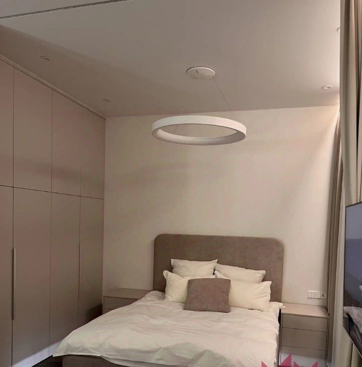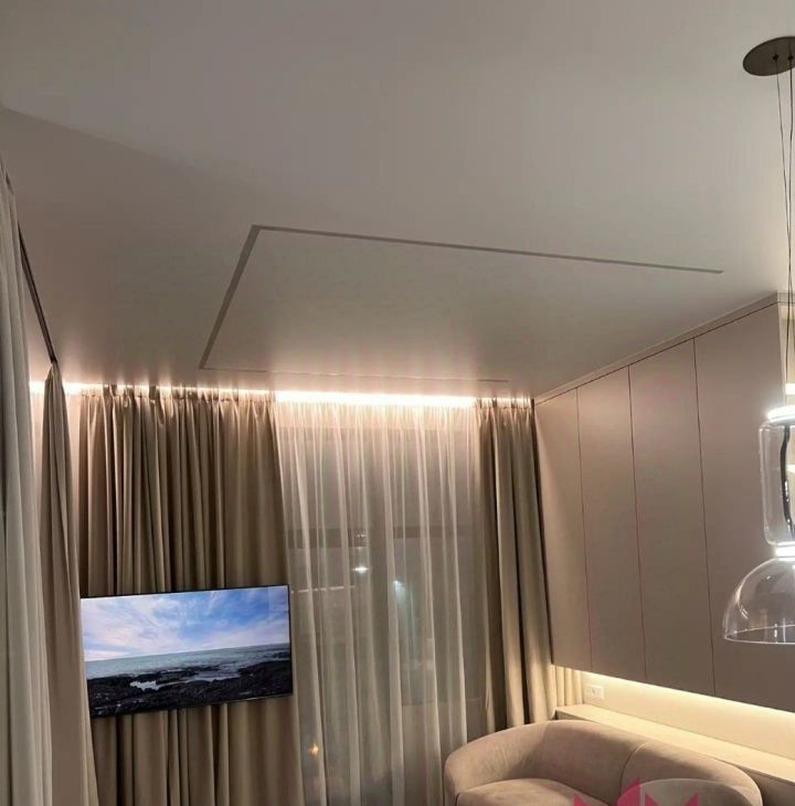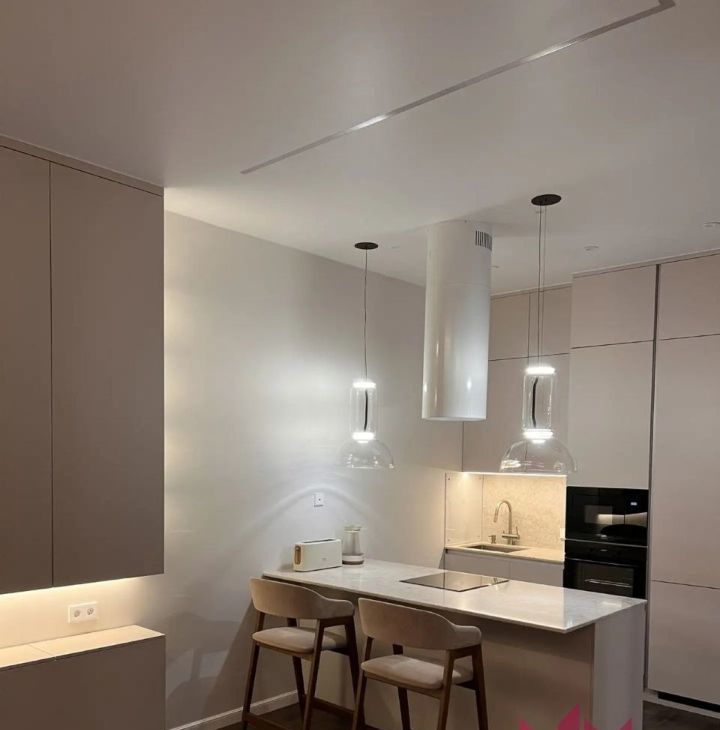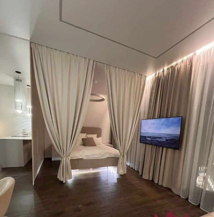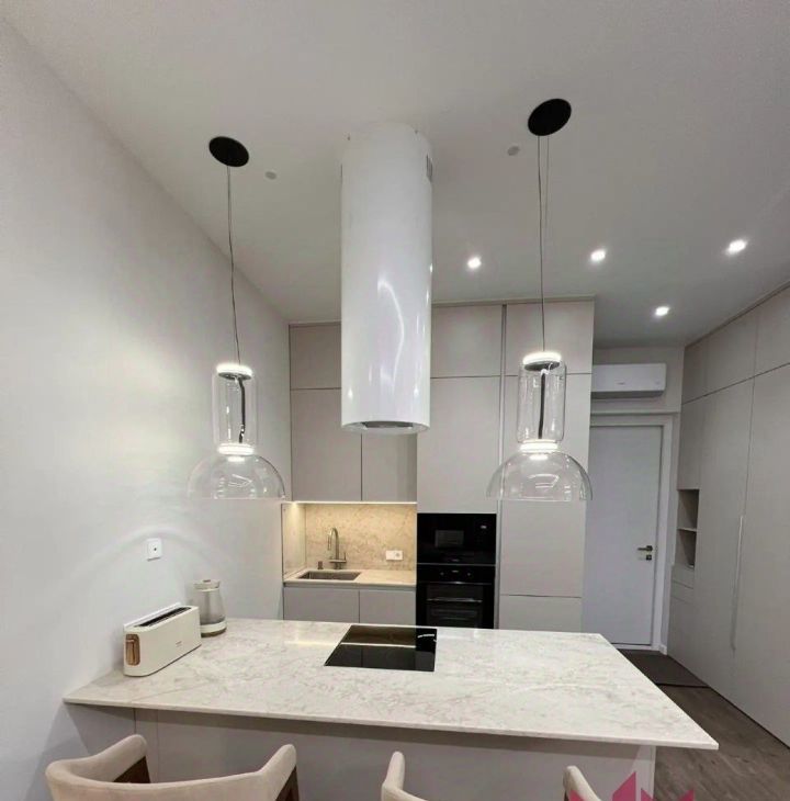 В квартире имеется вся необходимая мебель и техника. Телевизор на длинном кронштейне, можно смотреть его как сидя на кухне, так и развернув его к кровати. Разнообразная система освещения по всей квартире, есть возможность создавать уют и атмосферу релакса.