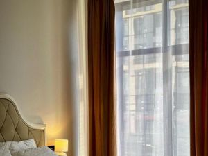 Из окон открывается великолепный вид на ночную Москву,а так же во внутренний двор,что обеспечивает тишину в квартире,а так же все шторы блэк-аут.