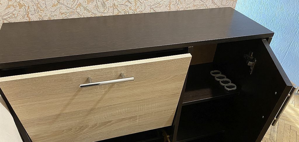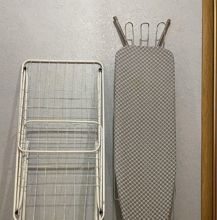 прихожая: встроенный шкаф-купе с зеркалом на двери, комод-обувница; стиральная машина с функцией BOSCH, гладильная доска, утюг, сушка для белья напольная.