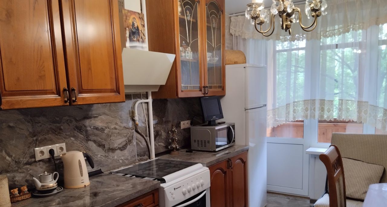 Газовая плита, вытяжка оригинальной конструкции, холодильник, микроволновка, стиральная машина, телевизор на кухне и прочее. До