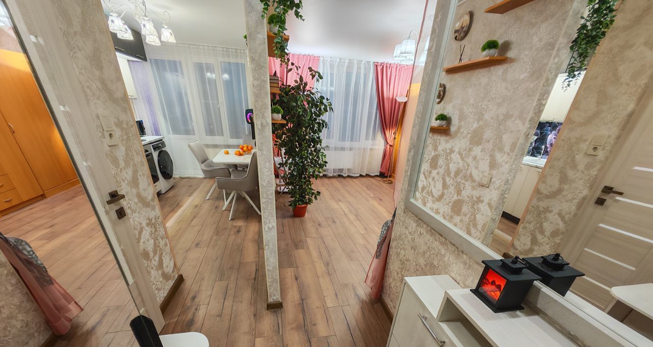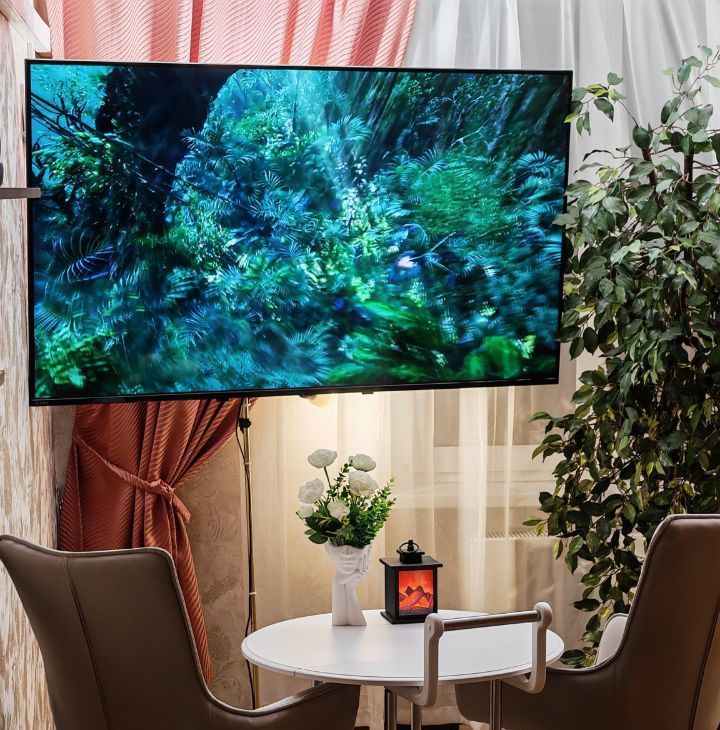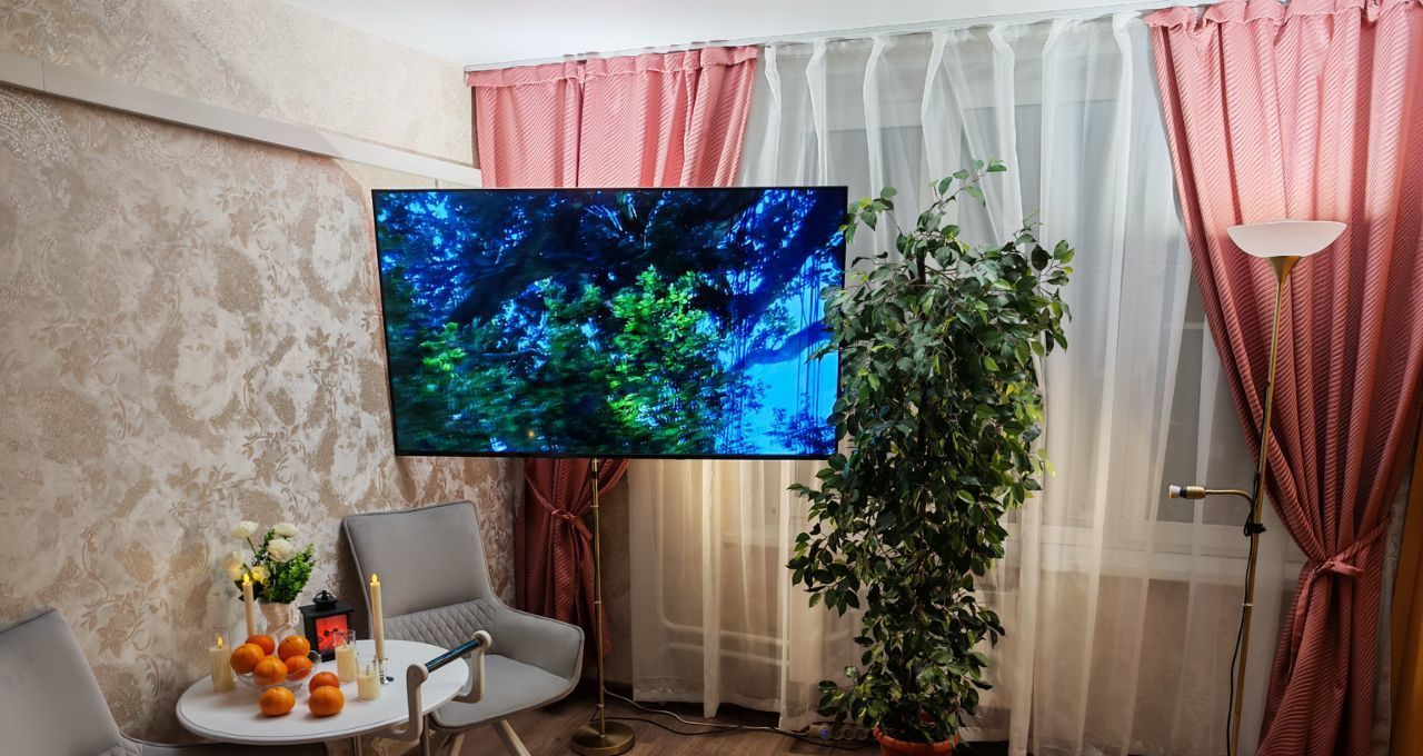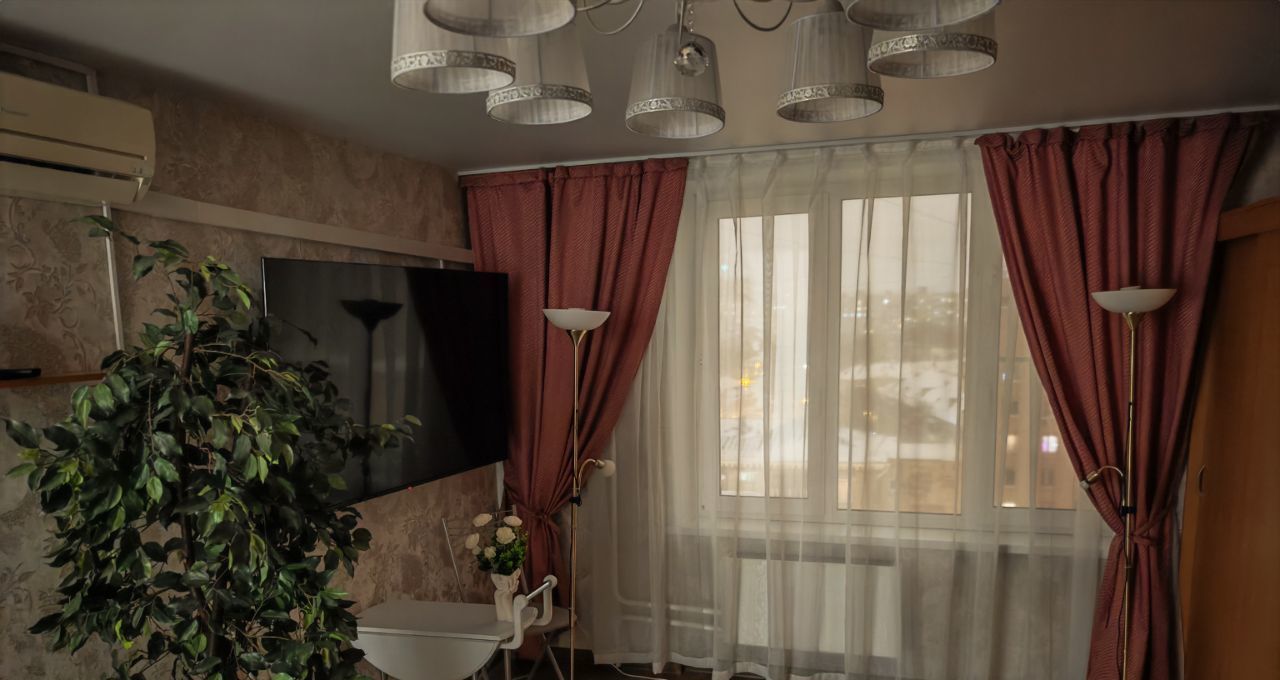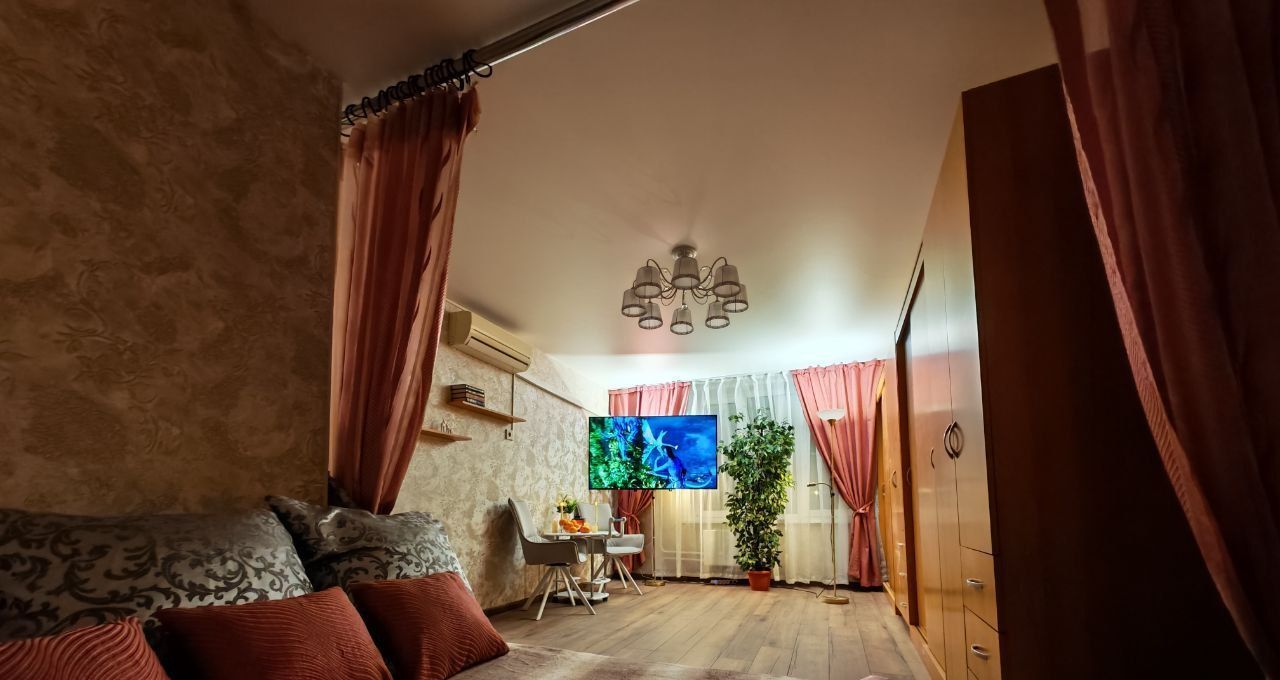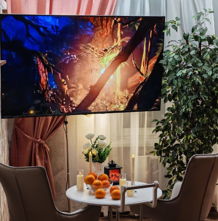 Имеется большой телевизор (диагональ 65") с поворотным механизмом, мебель для комфортного проживания: большая кровать с матрасом, подушками и теплыми пледами, современные вместительные шкафы, тумбочка с большим зеркалом и шкаф в прихожей, удобный обеденный стол со стеклянной столешницей и 3-мя крутящимися креслами, сервировочный столик на колесиках, два складных стула. Заказан лёгкий в передвижении надежный раскладной диван.