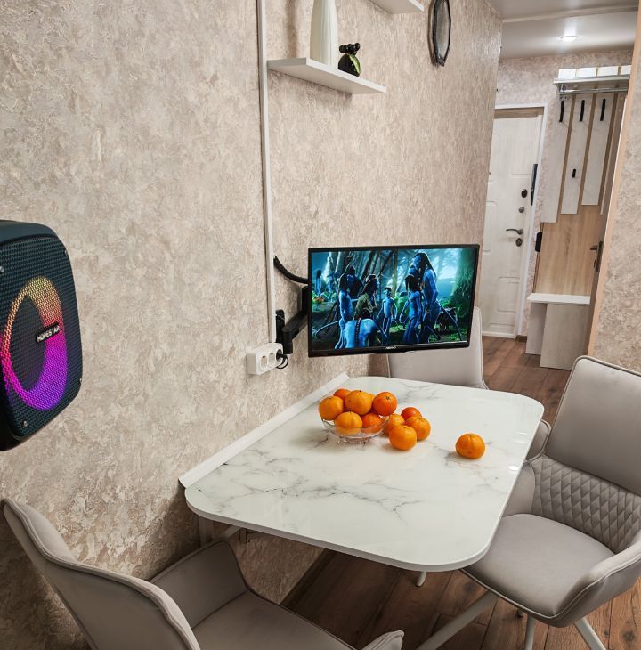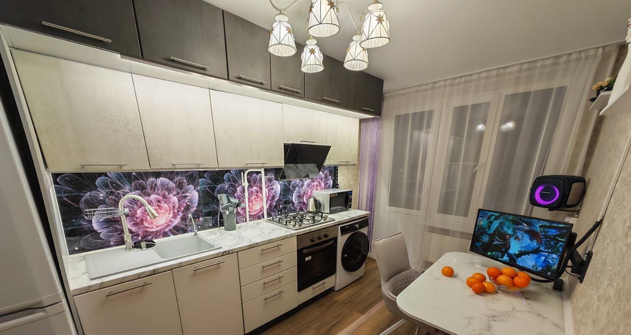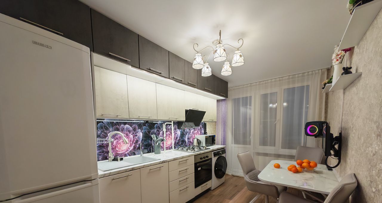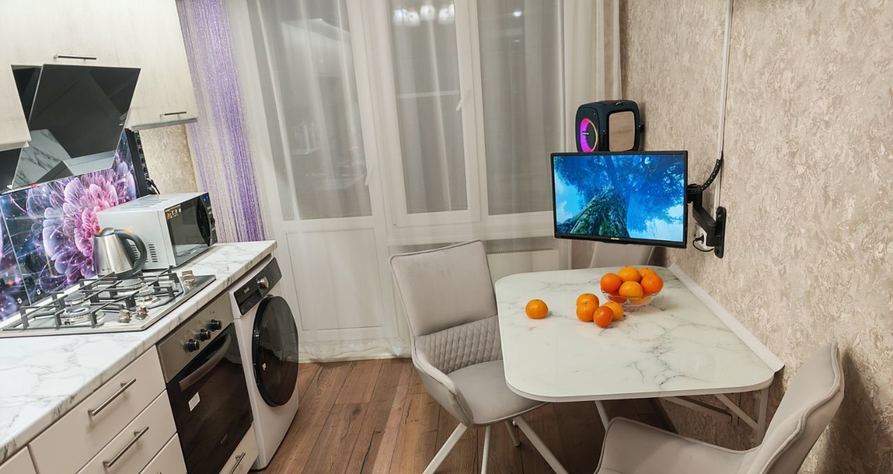 Стильный и максимально функциональный кухонный гарнитур с подсветкой и волшебным акцентом, вместительными антресолями под потолок выполнен в бело-серо-черном цвете, кухня оснащена всей необходимой техникой и посудой, включая новые столовый сервиз, бокалы, фужеры, кастрюлю, сковороду, органайзеры и столовые принадлежности. Есть второй телевизор и музыкальная блютуз колонка.