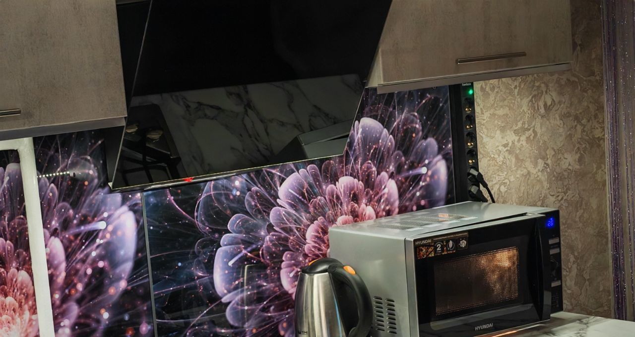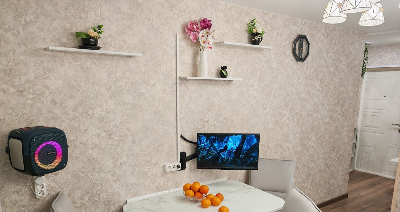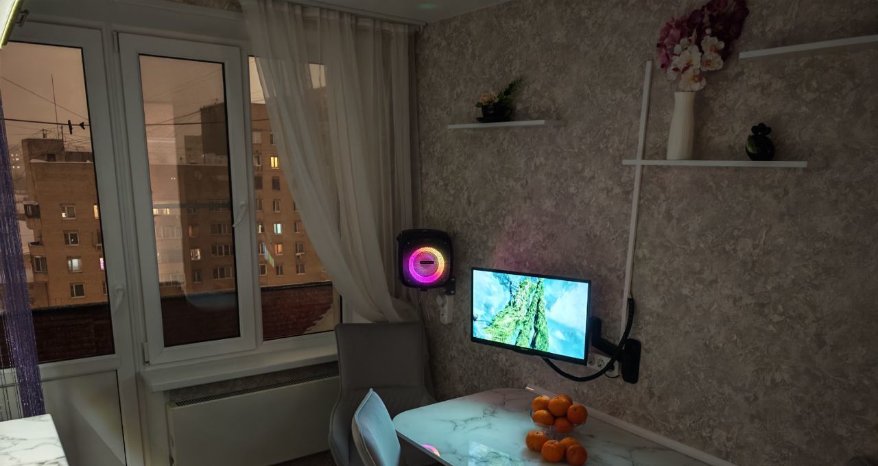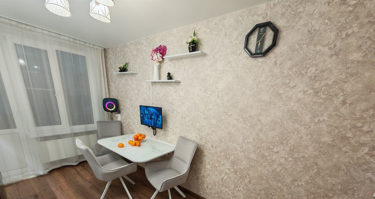 Стильный и максимально функциональный кухонный гарнитур с подсветкой и волшебным акцентом, вместительными антресолями под потолок выполнен в бело-серо-черном цвете, кухня оснащена всей необходимой техникой и посудой, включая новые столовый сервиз, бокалы, фужеры, кастрюлю, сковороду, органайзеры и столовые принадлежности. Есть второй телевизор и музыкальная блютуз колонка.