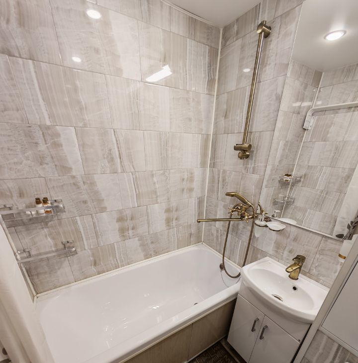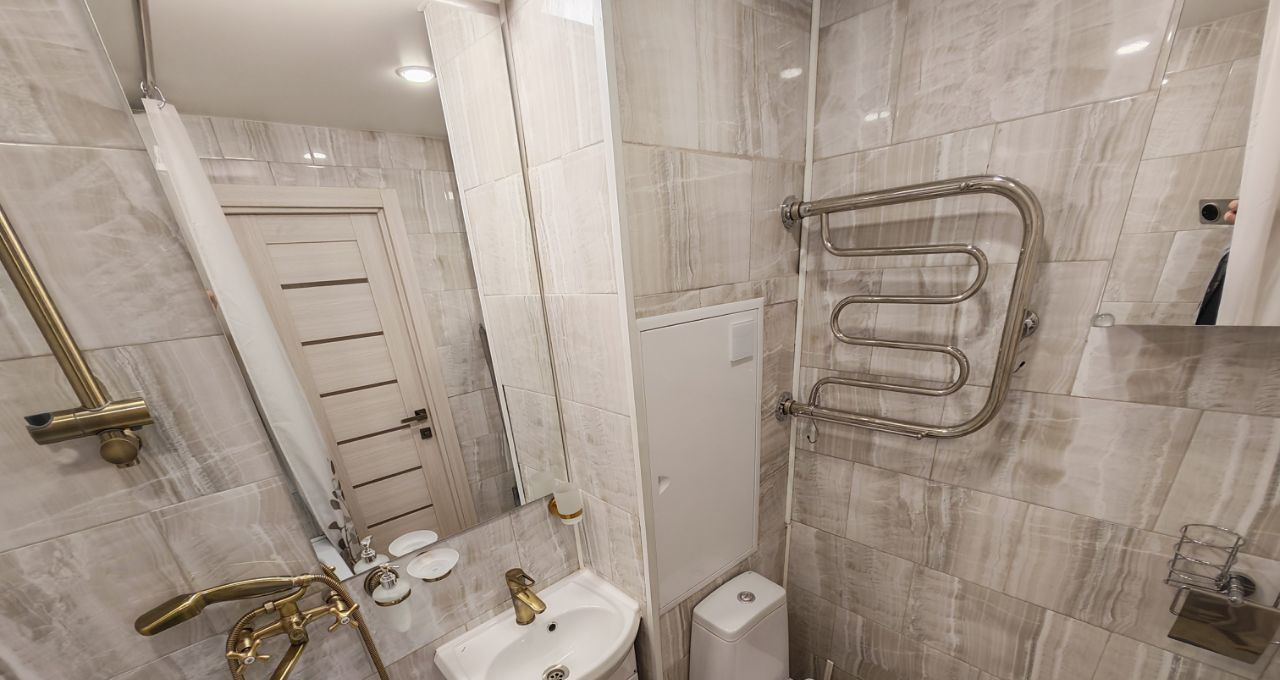 Ванная оснащена удобной настенно-потолочной сушилкой, полотенцесушителем, зеркалом с подсветкой, функциональными полками и настенными шкачиками.