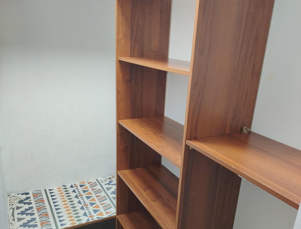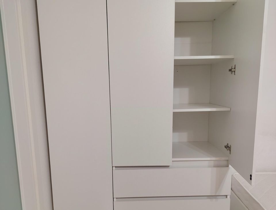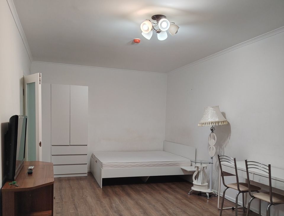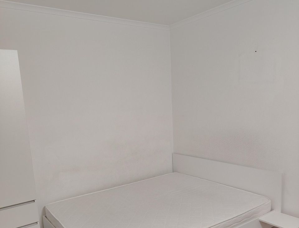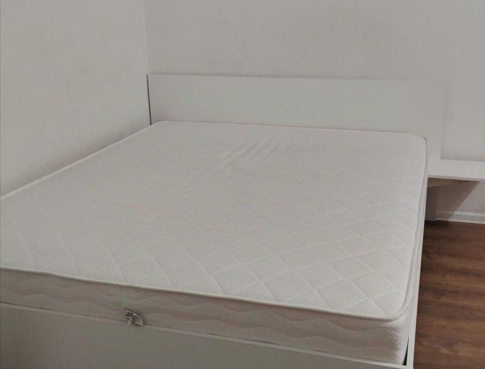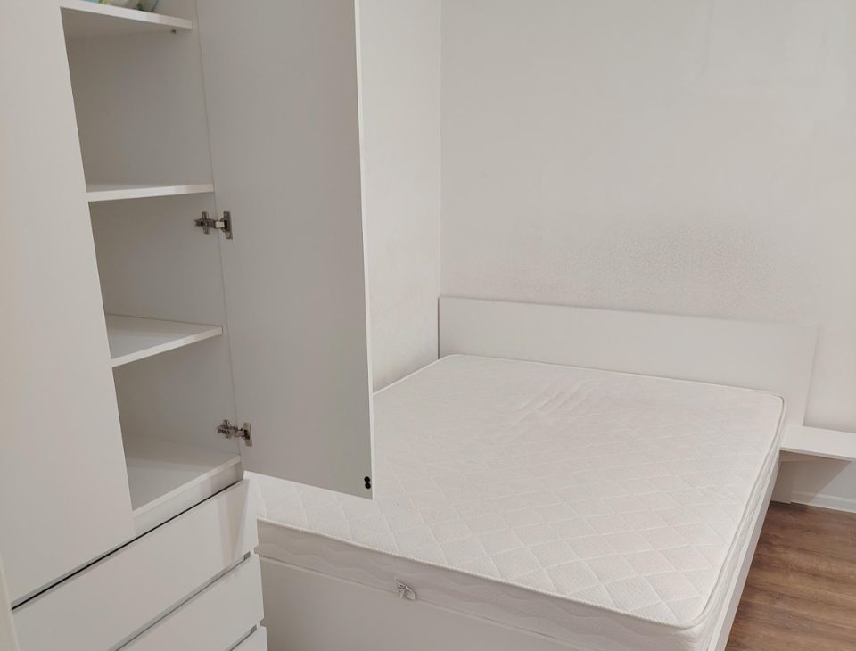 В квартире есть всё необходимое. Двуспальная кровать с хорошим матрацем, 2 шкафа для хранения вещей. Много места для дополнительной мебели.